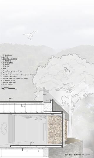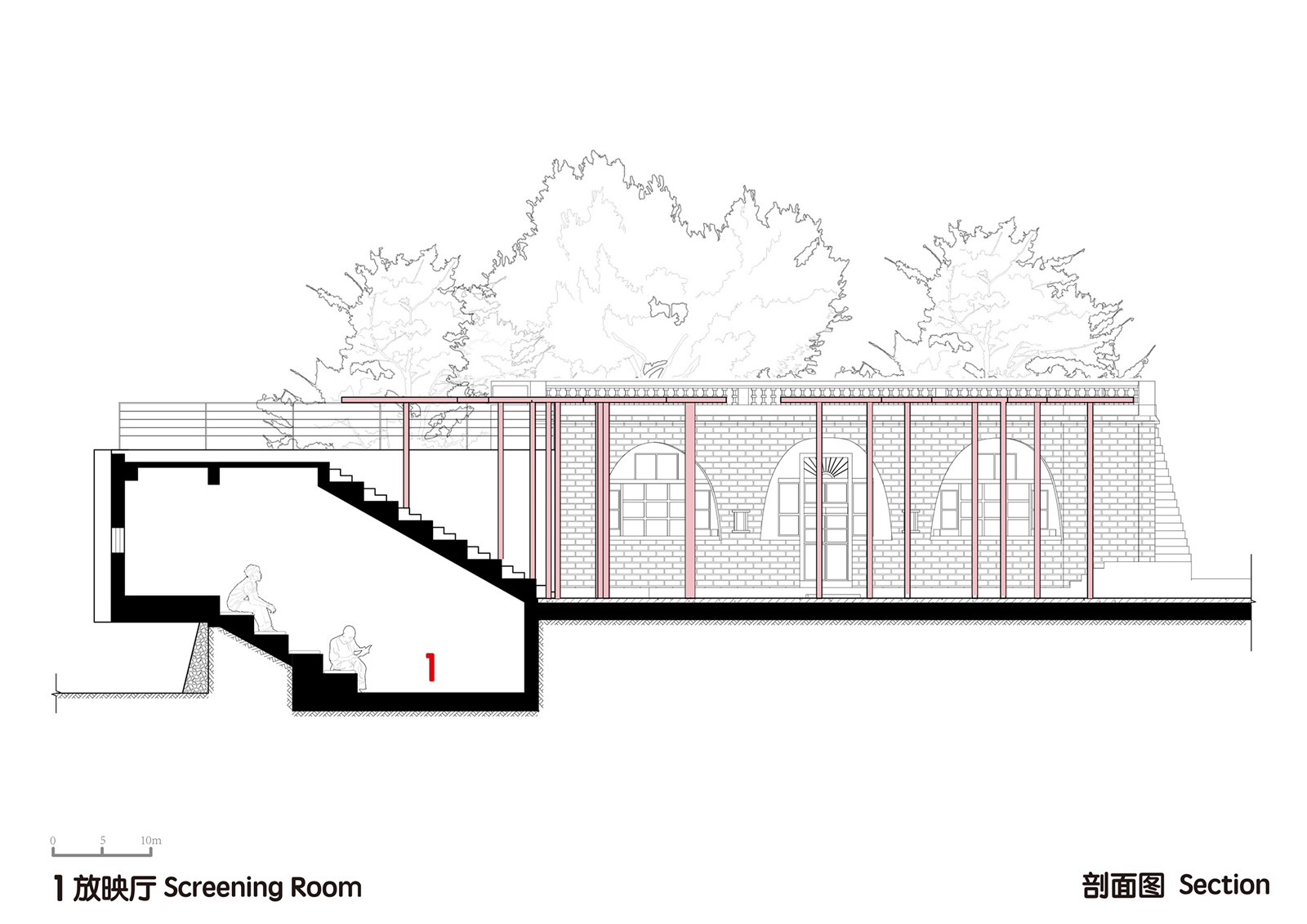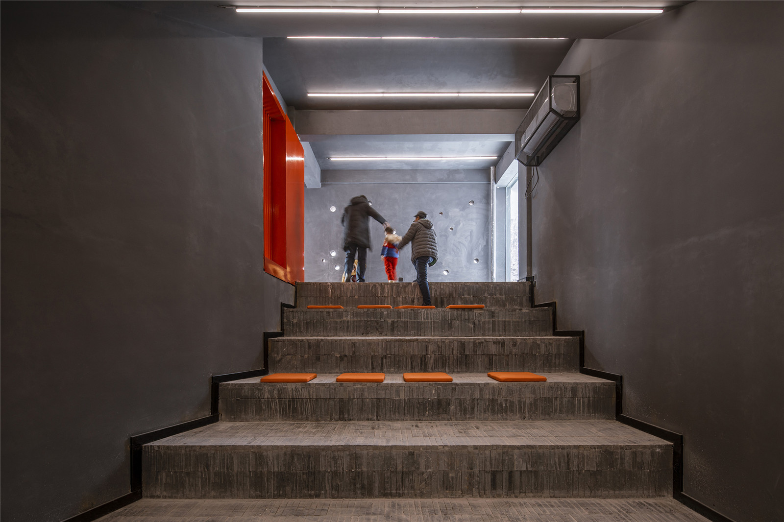 Using the indoor space under the inclined floor of the outdoor stand, the designer designed a sunken theatre, where movies or video content can be shown, complementing the functions of the outdoor stand, meeting the needs of indoor activities in winter in the northern region. The southwest side of the small theatre overhangs from the site, and the contrast between the real and the virtual formed by the floor-to-ceiling glass and the stone wall further strengthens the visibility of the building, which provides a visual guide for the way into the old village. Together with the indoor theatre, historical exhibition hall and outdoor space, a new public space under the big locust tree has been formed, which enriches the rural spare time life and provides a venue for the local people and the new villagers in the future.