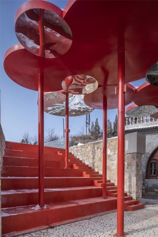 改造后的窯洞外觀與紅色裝置Remoulded cave dwelling and red installation.jpg
