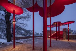 Here, the designer also tries to "confuse" the boundary between architecture and art installation. On the outdoor stands, umbrella-like structures are covered with red color, forming a strong visual language different from conventional architecture. It tends to be more artistic expression, simple, strong, even slightly extreme. At the same time, red gives the space a new aura: more open publicity, dramaticism, narrativity and tension are simpler and more powerful than architectural language.
