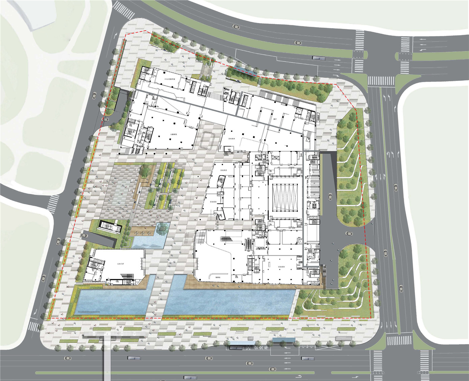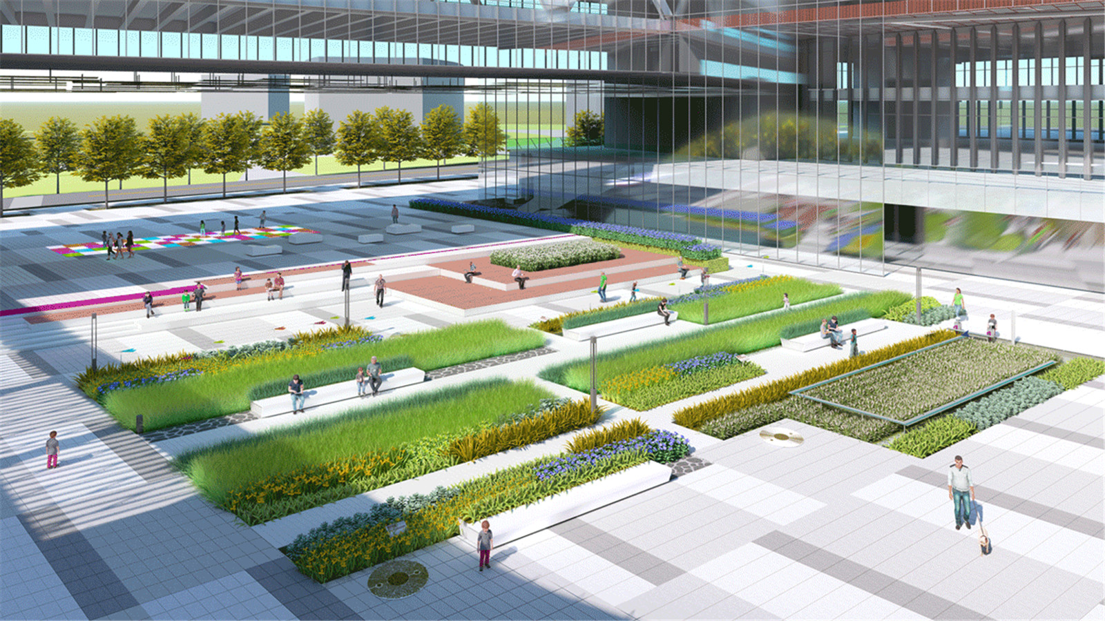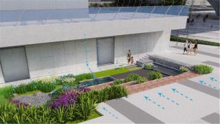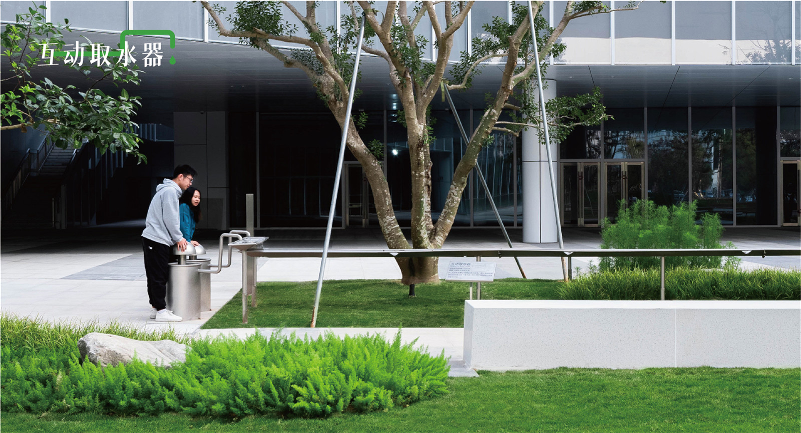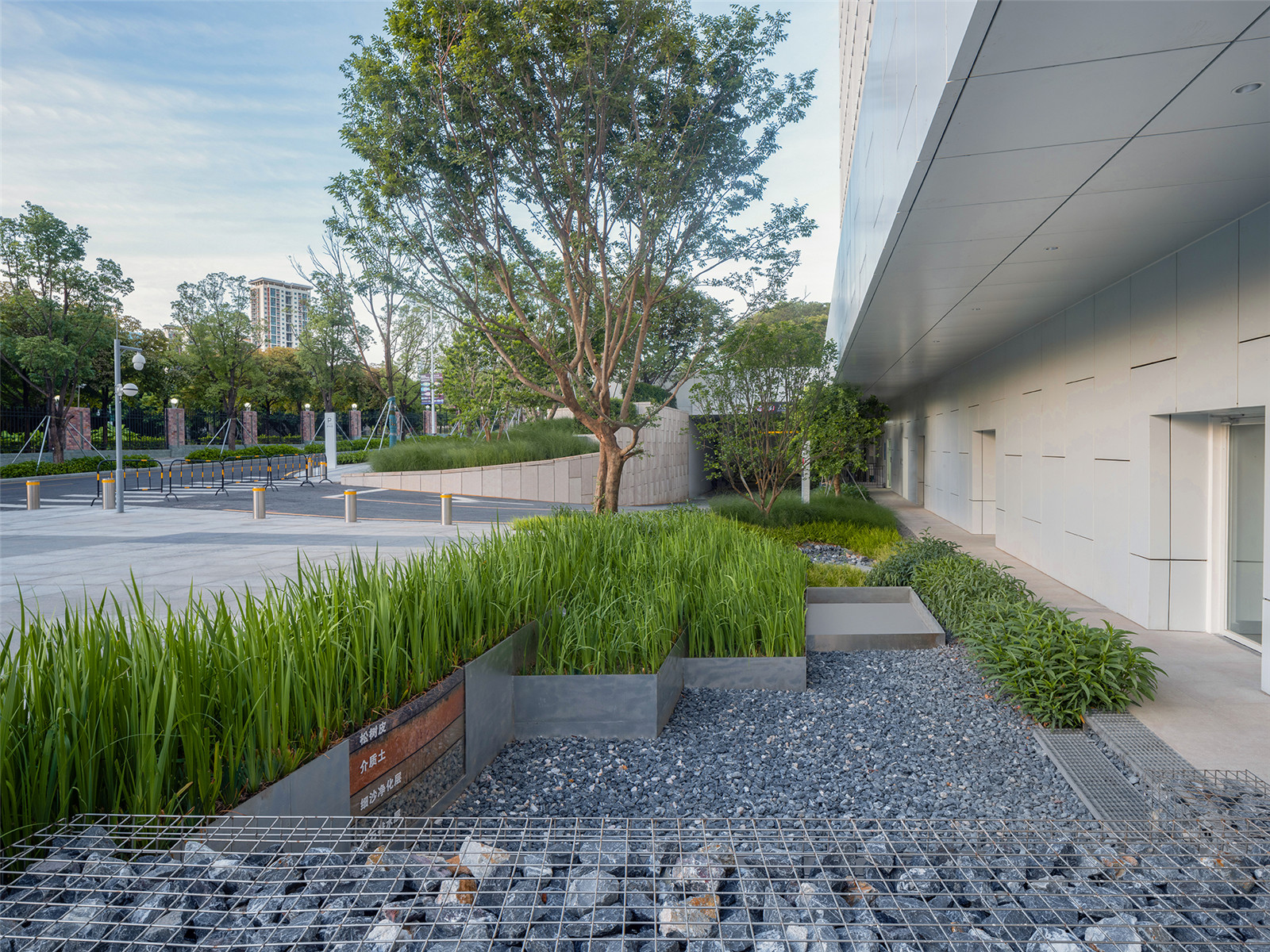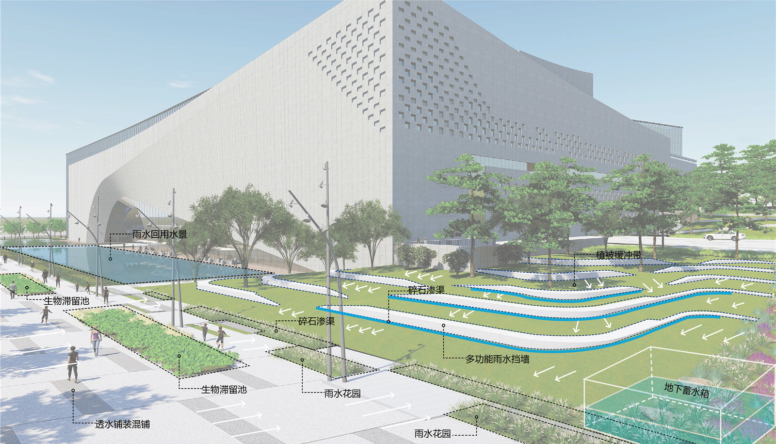 The lower land in the west nearby the building is ideal for sponge city display. When it rains, visitors will have an experience of the collection, infiltration, purification and storage of rainwater.