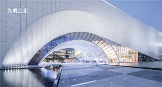 我們在建筑的正立面前設(shè)計了長170m,寬18m的大型鏡面水景,利用建筑拱形入口與水景的倒影完美形成一只巨大的眼睛,被稱為“光明之眼”,現(xiàn)在已經(jīng)成為新晉的網(wǎng)紅打卡點。