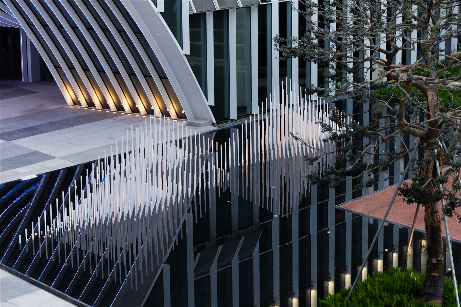 作為引導(dǎo)性的入口標(biāo)志和視覺焦點,在燈光的映襯下,整個參數(shù)化的雕塑對光線的不同反射,呈現(xiàn)出霧噴的視覺效果,如同山間云霧繚繞。