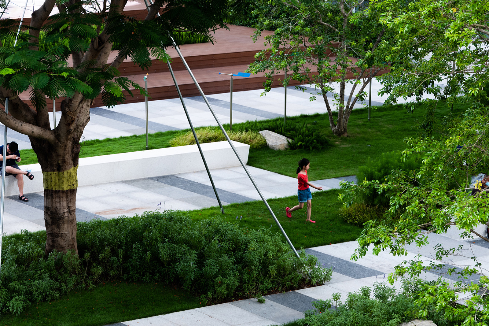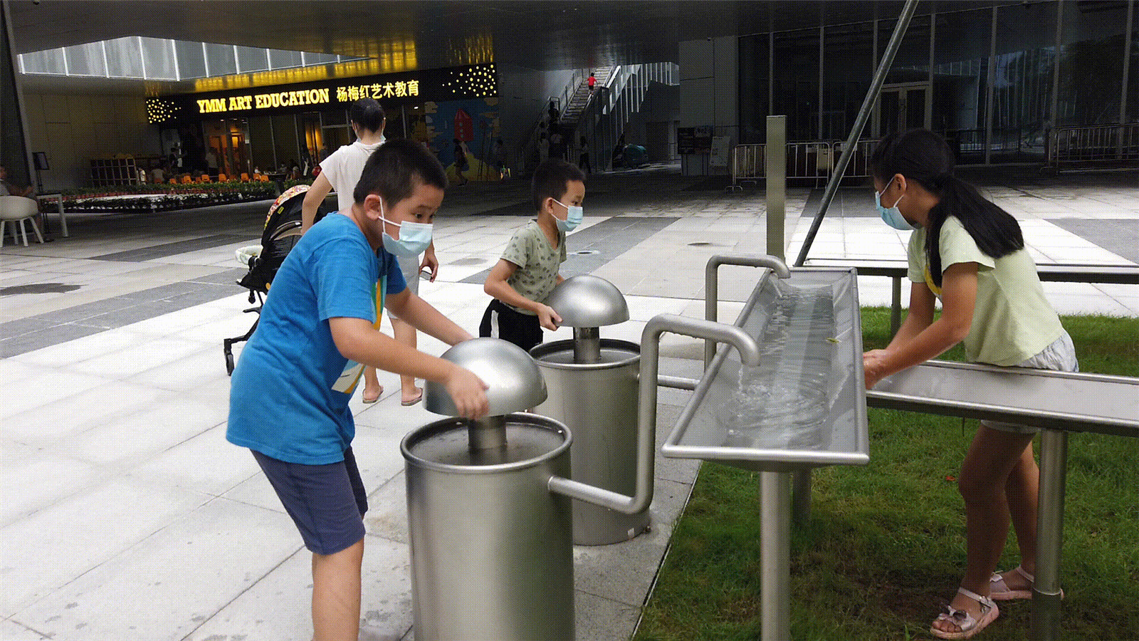 The L-shaped terrace is designed with interactive water faucets, cultural wind vanes, cultural carvings, etc. Moreover, we created movable seats with luminous concrete, making the space dynamic and flexible. With shade around most of the time during the day, people are willing to stay here and have a rest.