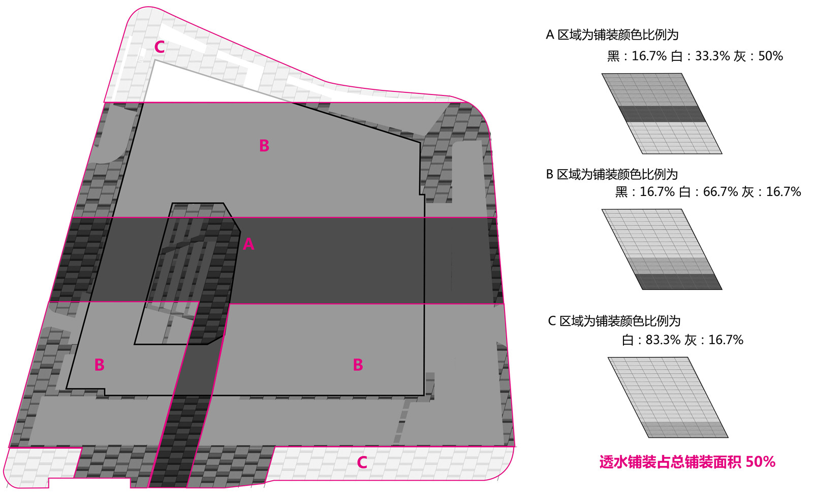為了呼應(yīng)在地抽象田園的設(shè)計理念,同時滿足50%的透水率需求,我們專門定制了平行四邊形的鋪裝,包括傳統(tǒng)石材和透水磚,并且聯(lián)合專家共同研發(fā)了混拼技術(shù),來達(dá)到更好的景觀效果。