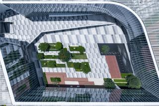 For quadrangle-style buildings, the atrium is an important area for rainwater management. Since traditional landscape cannot deal with floods, we created a rainwater garden here which is divided into pieces and looks look farmland.