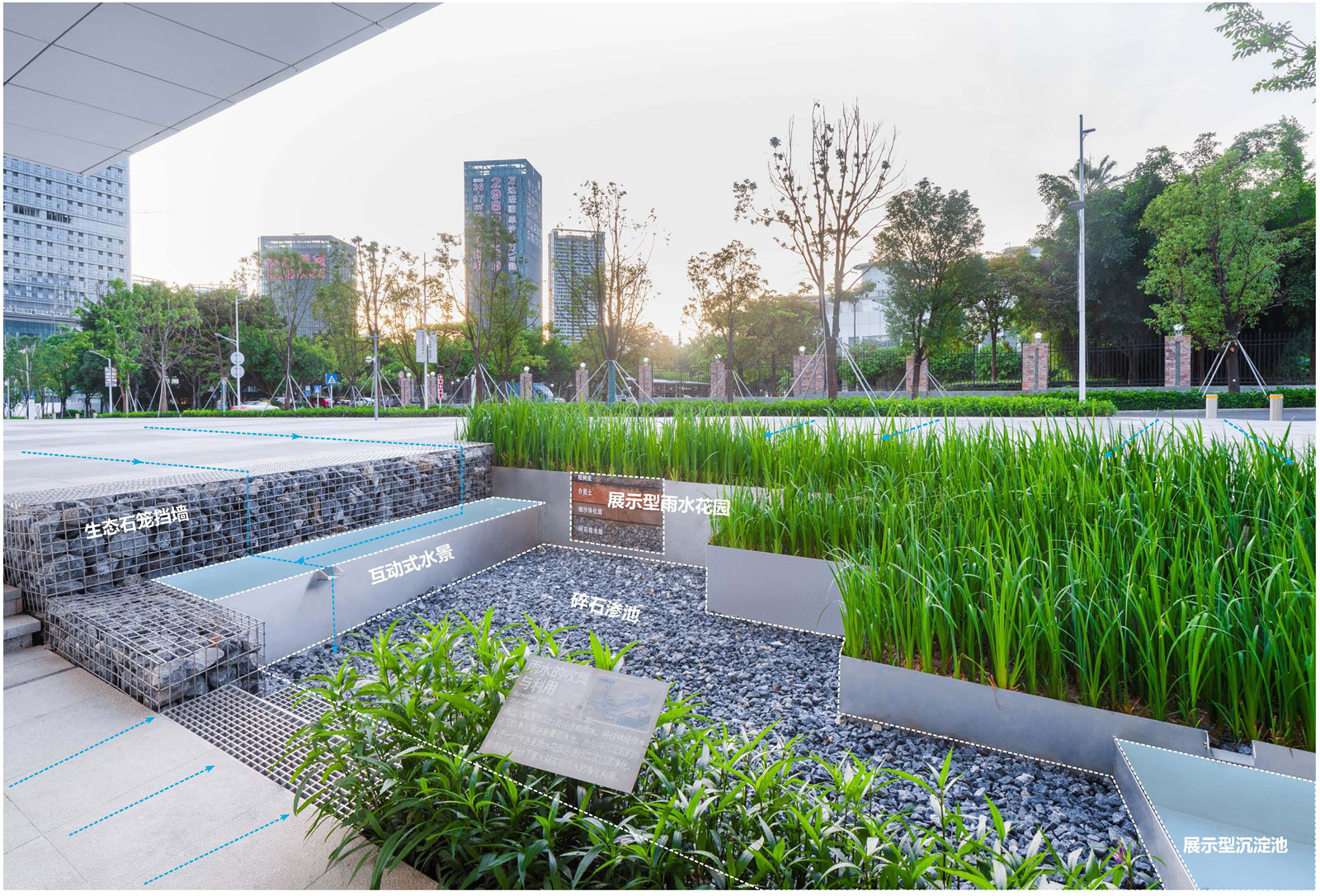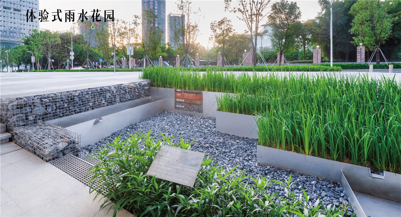 根據(jù)計算結(jié)果,我們在易淹沒區(qū)域融入了展示型雨水花園、生物滯留池、下凹綠地、綠色屋頂、植被緩沖帶、生態(tài)碎石渠等海綿設(shè)施,并將其進行組合串聯(lián),收集的雨水最終匯入地下蓄水箱進行回用,最終實現(xiàn)年徑流總量控制率74.3%,面源污染控制率56%,透水鋪裝率50%的指標(biāo),滿足深圳市海綿城市建設(shè)要求。