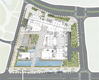 由于項目的四面都有出入口,動線較為復(fù)雜,在進行鋪裝設(shè)計時,我們根據(jù)場地活躍程度不同和所預(yù)測的人群密度的變化,應(yīng)用參數(shù)化技術(shù),設(shè)計出具有導(dǎo)視功能的漸變鋪裝系統(tǒng),強化視覺的引導(dǎo)性。同時74°的平行四邊形鋪裝與建筑平行,建筑與景觀達(dá)成風(fēng)格和序列的統(tǒng)一。