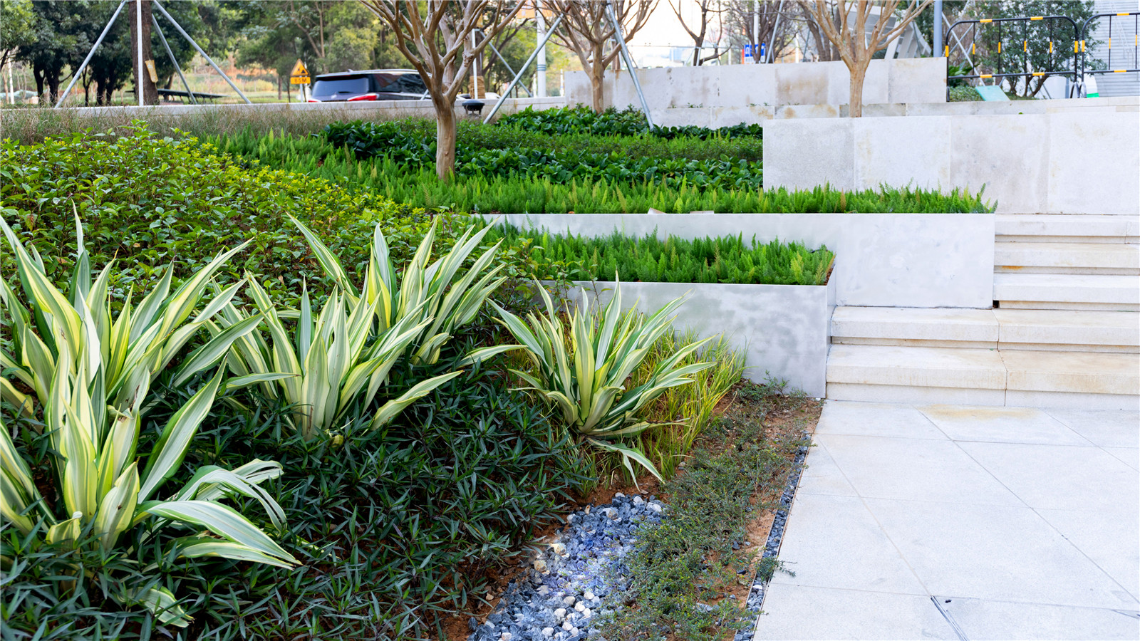 Besides, a belt rainwater garden is designed along the slope to collect rainwater from the footpath and the slope. There is also gabion to prevent high-speed rainwash. In addition, built in the lower part of the eastern slope is a rainwater garden, which is connected with the underground facilities and presents unique beauty above the ground.