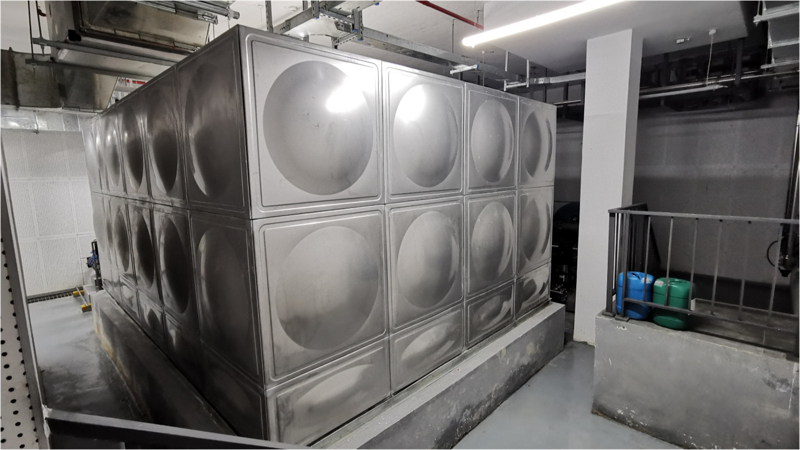 To reduce the maintenance cost for the 3,000㎡ waterscape, we built two 750m3 huge reservoirs in the underground parking for rainwater recycling.