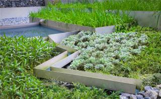 由于合院式建筑特點導(dǎo)致中庭是重要的雨水管理區(qū)域,暴雨時來自四周建筑的雨水會對場地進行淹沒,傳統(tǒng)的綠化顯然不能解決這一問題,于是我們在此設(shè)計了田字格式的雨水花園。