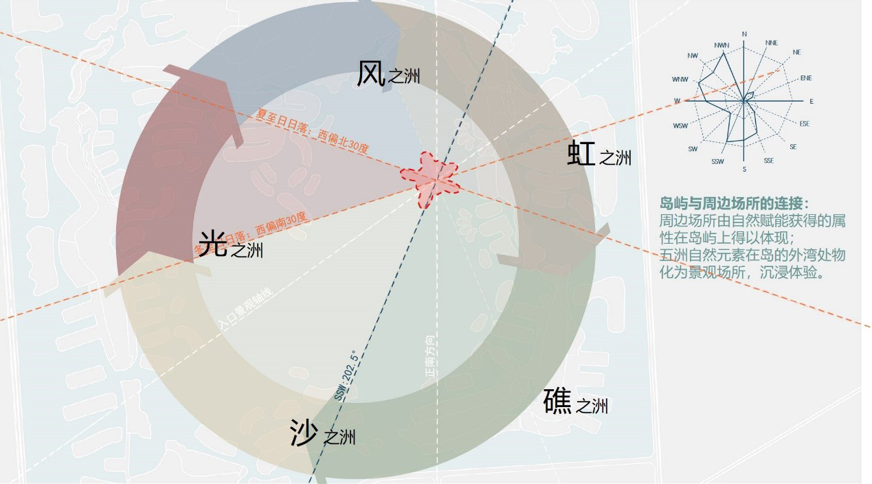 在現(xiàn)場的場域觀察讓設(shè)計團隊得以認識到場地最大的特色——自然賦能。這座巨大的島嶼隨著時間的變化呈現(xiàn)出自然演進的過程,島上現(xiàn)存如風、光、雨、塘、沙及礁石這些常見的自然狀態(tài)及元素,會混合交替出現(xiàn),時刻提醒著設(shè)計團隊,作為自然界的一份子,需要更好的處理人與自然依存的關(guān)系,才能營造長期和諧共生的環(huán)境。