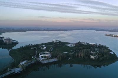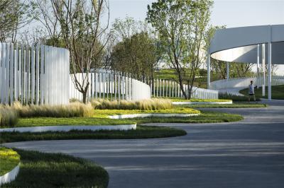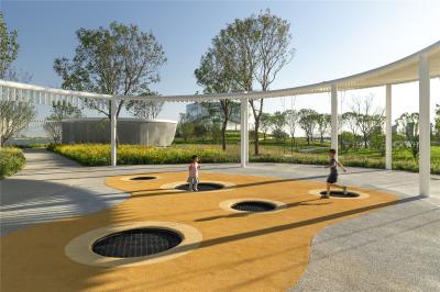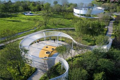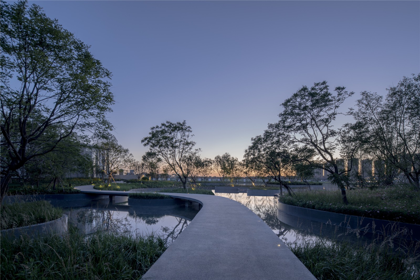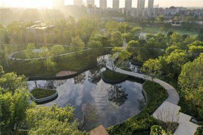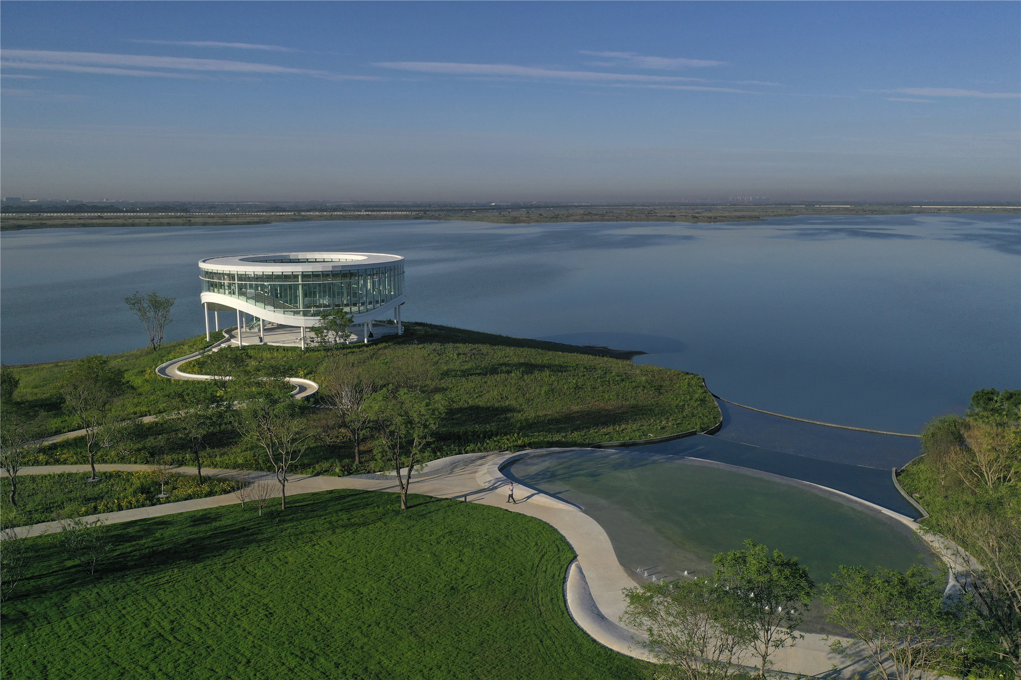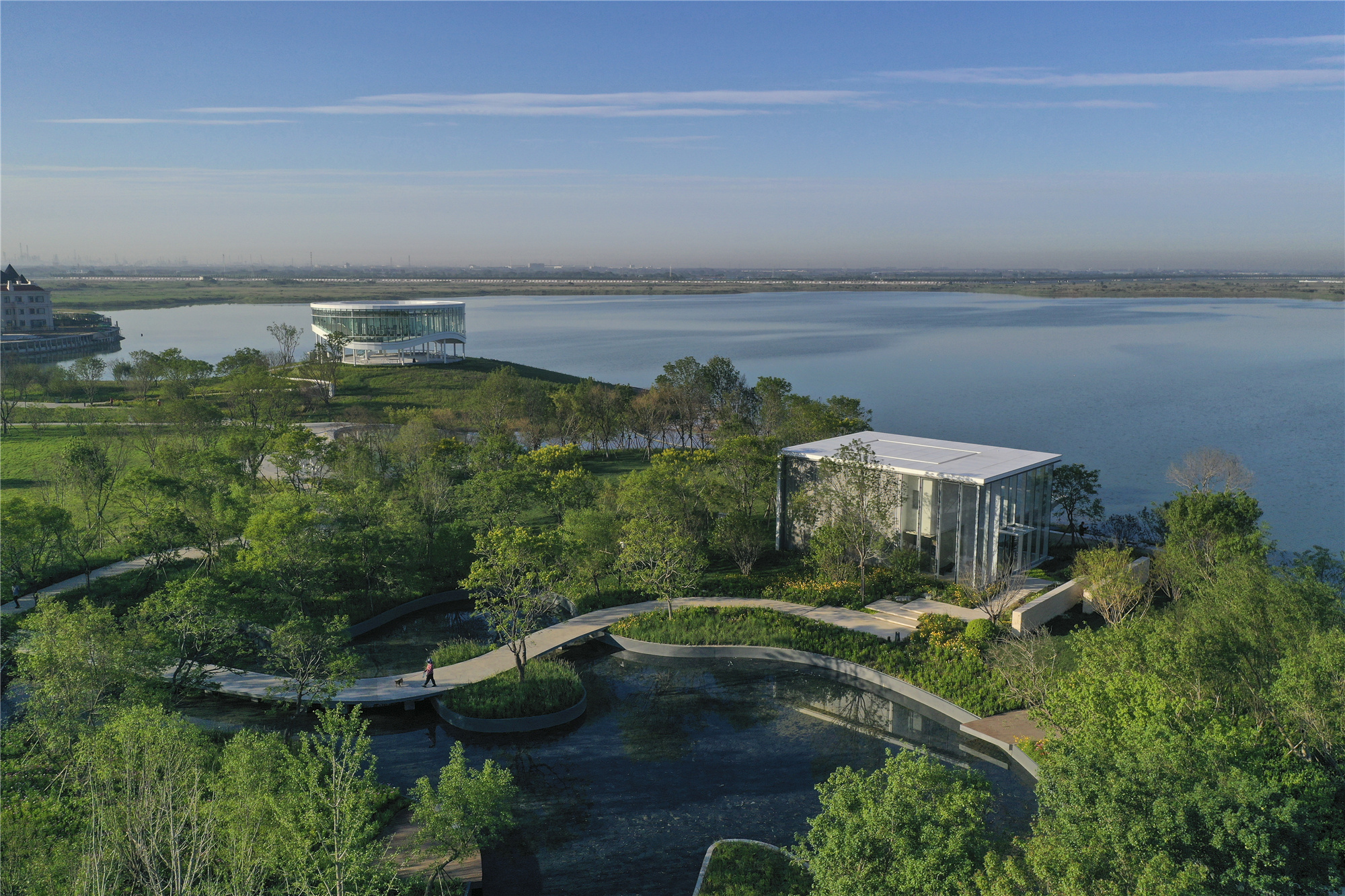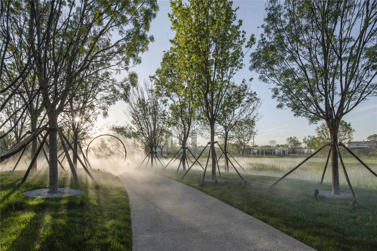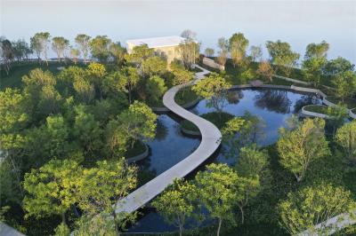 其次,是解決場地雨洪問題。由于天嘉湖原為津南水庫,有著嚴格的生態(tài)紅線,無法向天嘉湖排水,因此設(shè)計需要在島內(nèi)部解決洪澇及雨水排放等問題。根據(jù)整體地形變化,設(shè)計團隊在地勢低洼處設(shè)置多處濕地景觀。