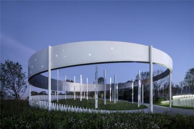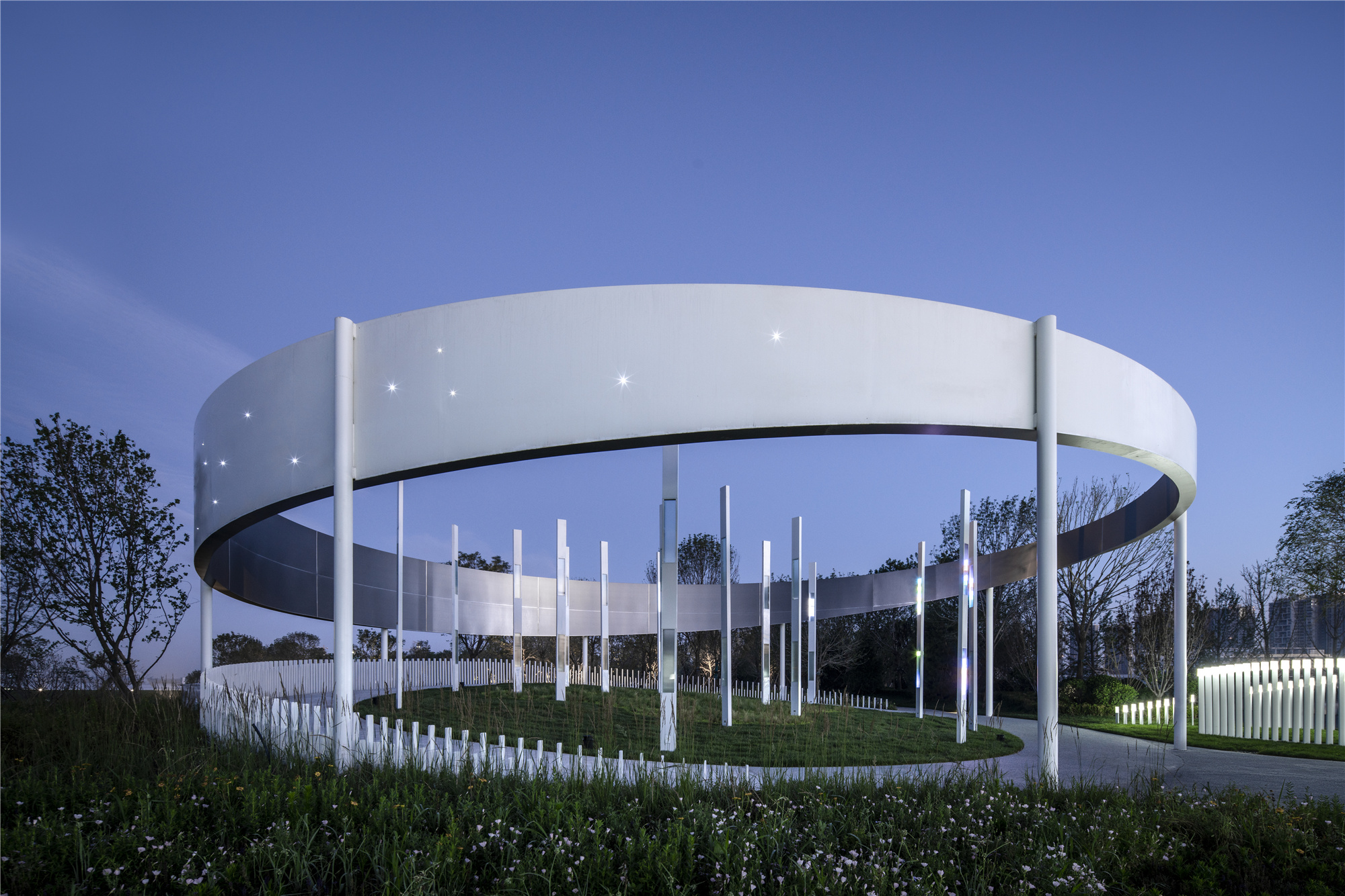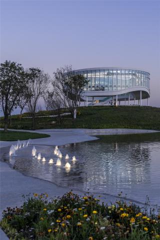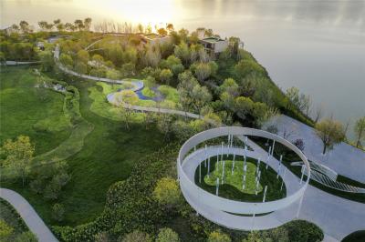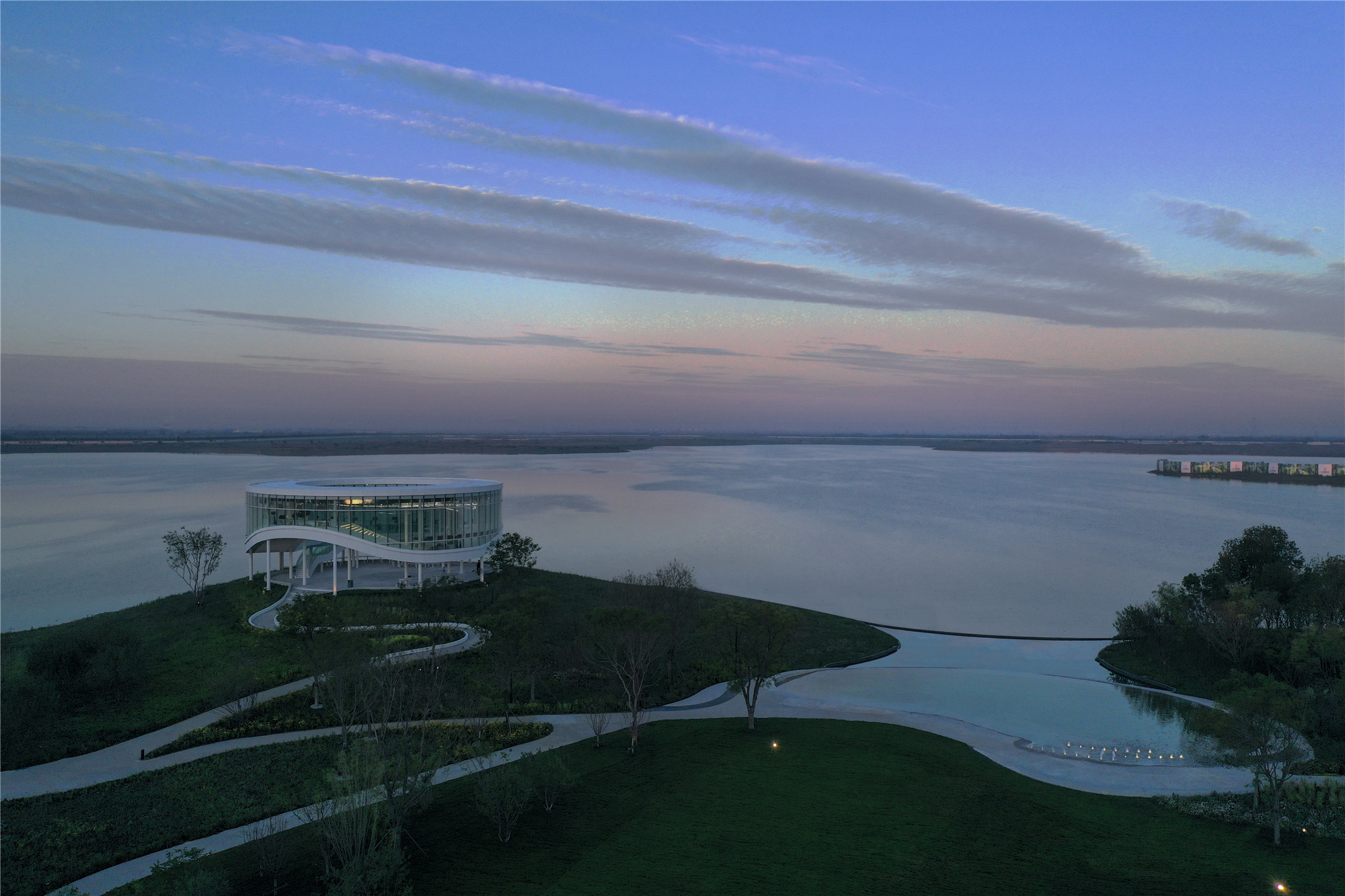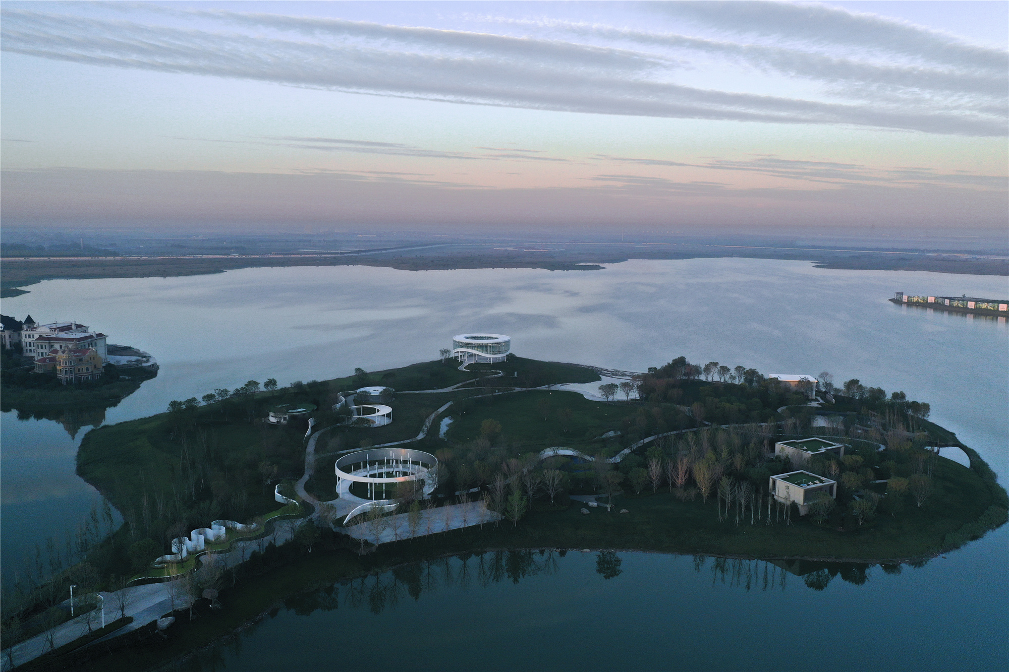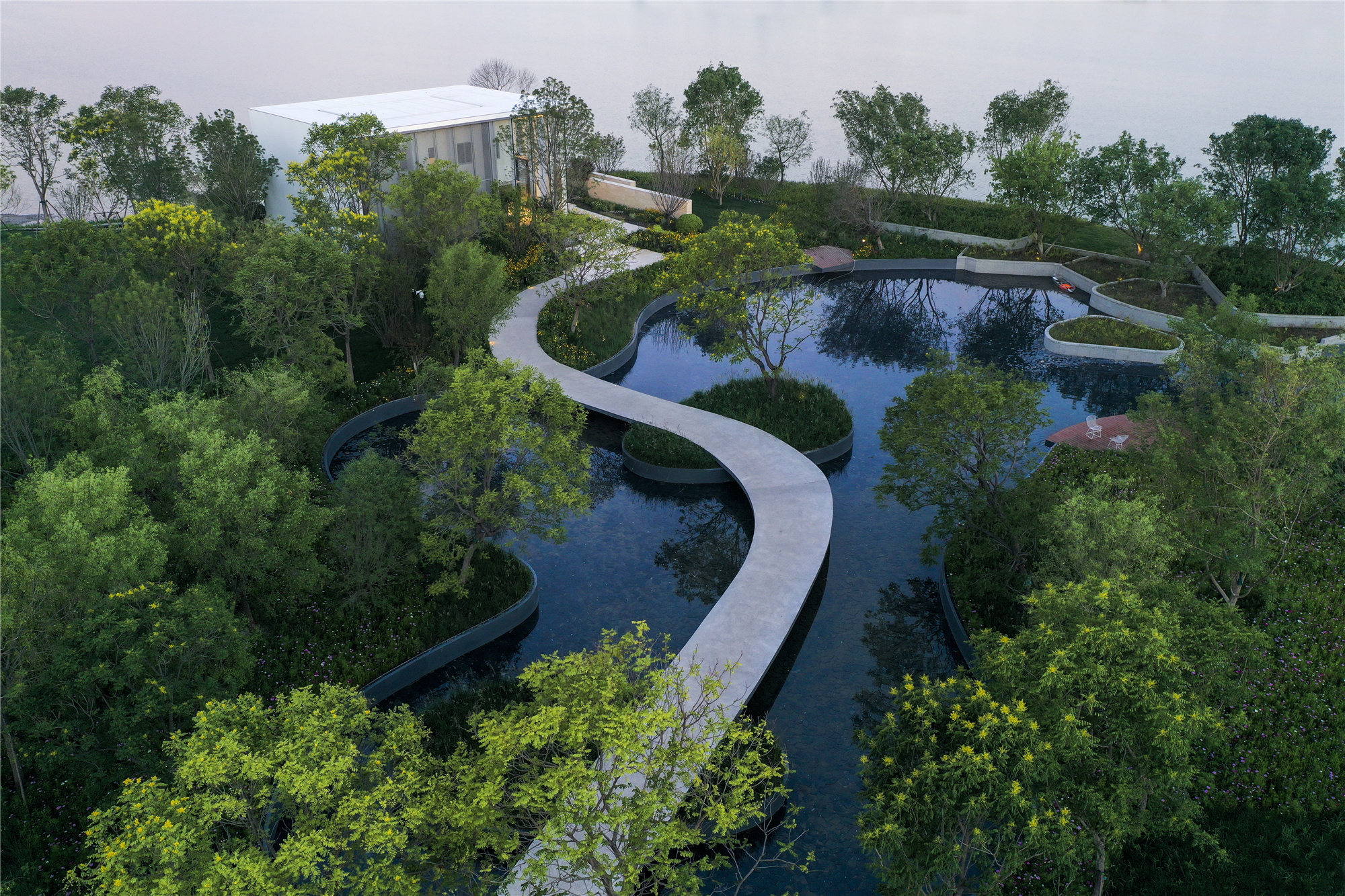 在島的南側(cè),設(shè)計團隊利用島上的挖方堆出一個8m高的小山坡,成為了更安靜更獨立的島上精神高地。山坡上的云端藝術(shù)館作為島上的至高點,能為登島者提供一個暫時逃離地表的眺望空間:一個輕盈靈動的藝術(shù)環(huán)廊和一個360度全景的空中花園。自然、藝術(shù)、純粹這些關(guān)鍵詞貫穿于藝術(shù)館的設(shè)計中,讓這座變成整個環(huán)湖片區(qū)的精神燈塔。