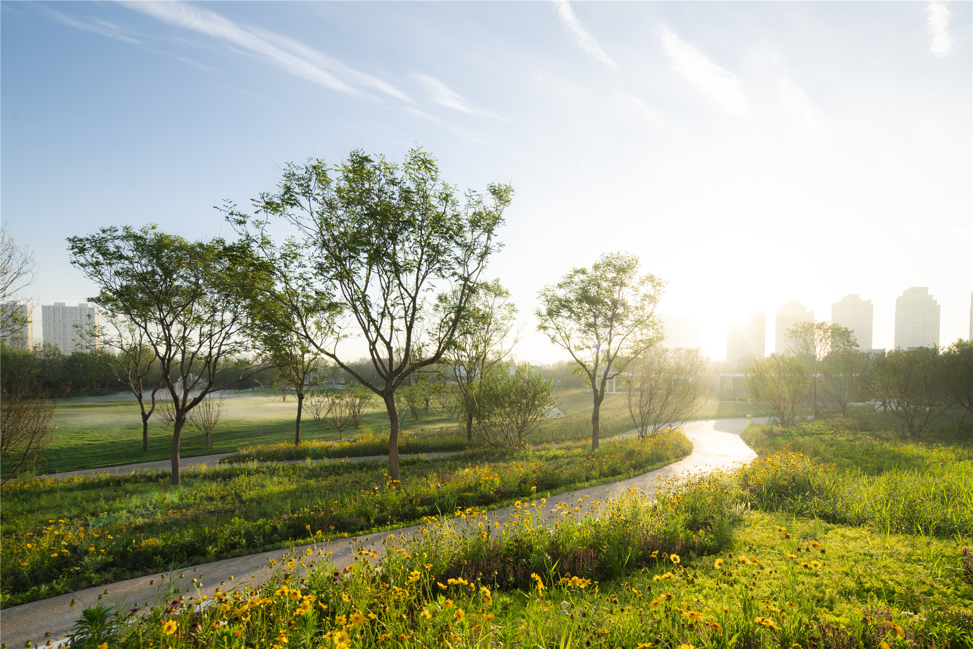 設(shè)計團隊選用能夠季相色彩變化較為豐富的樹種作為點景樹,能夠形成空間構(gòu)架,強化畫面感,如:國槐、欒樹、五角楓、絲綿木、秋紫白蠟等樹種。在土層較厚地形地勢高處增加早、晚櫻的布置。而在地形低處,改良土層很薄或近乎不存在,并且由于匯水形成積水持續(xù)較長時間的水濕地帶,這些地帶因勢利導選用了高抗性、觀賞期較長的水濕生植物,包含燈芯草、黃菖蒲、千屈菜,為喜歡濕地的野生小動物提供了棲地和食源。