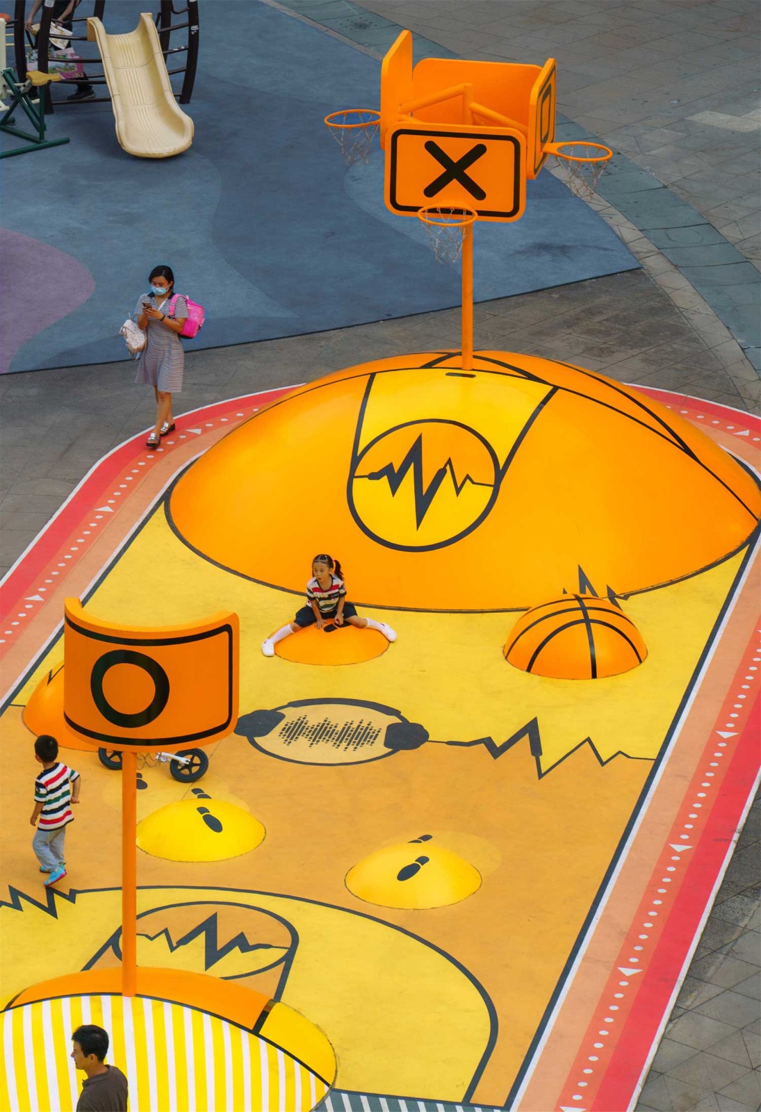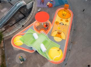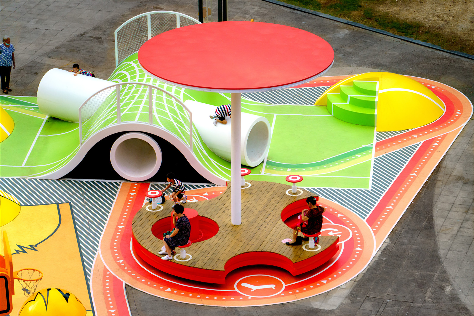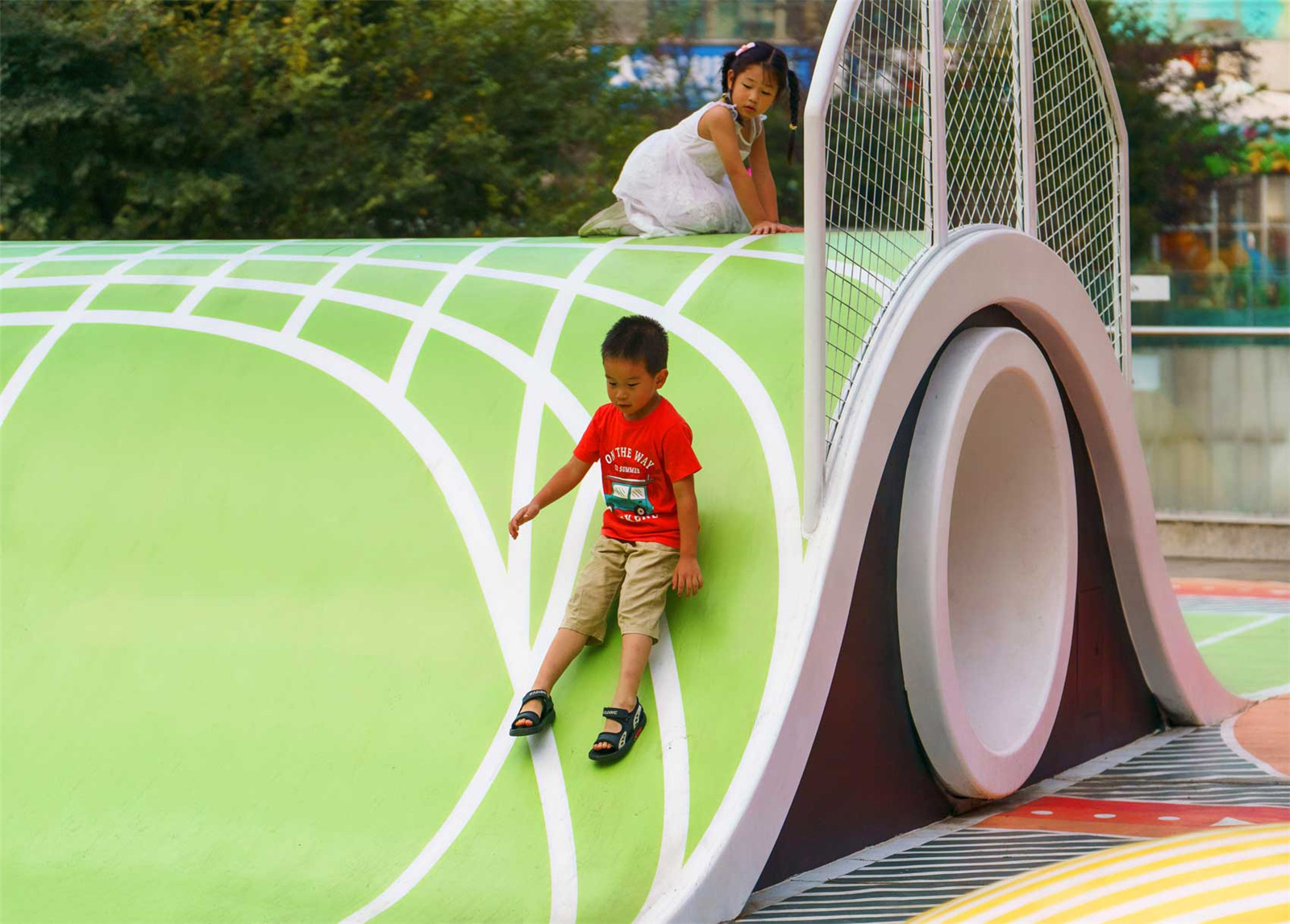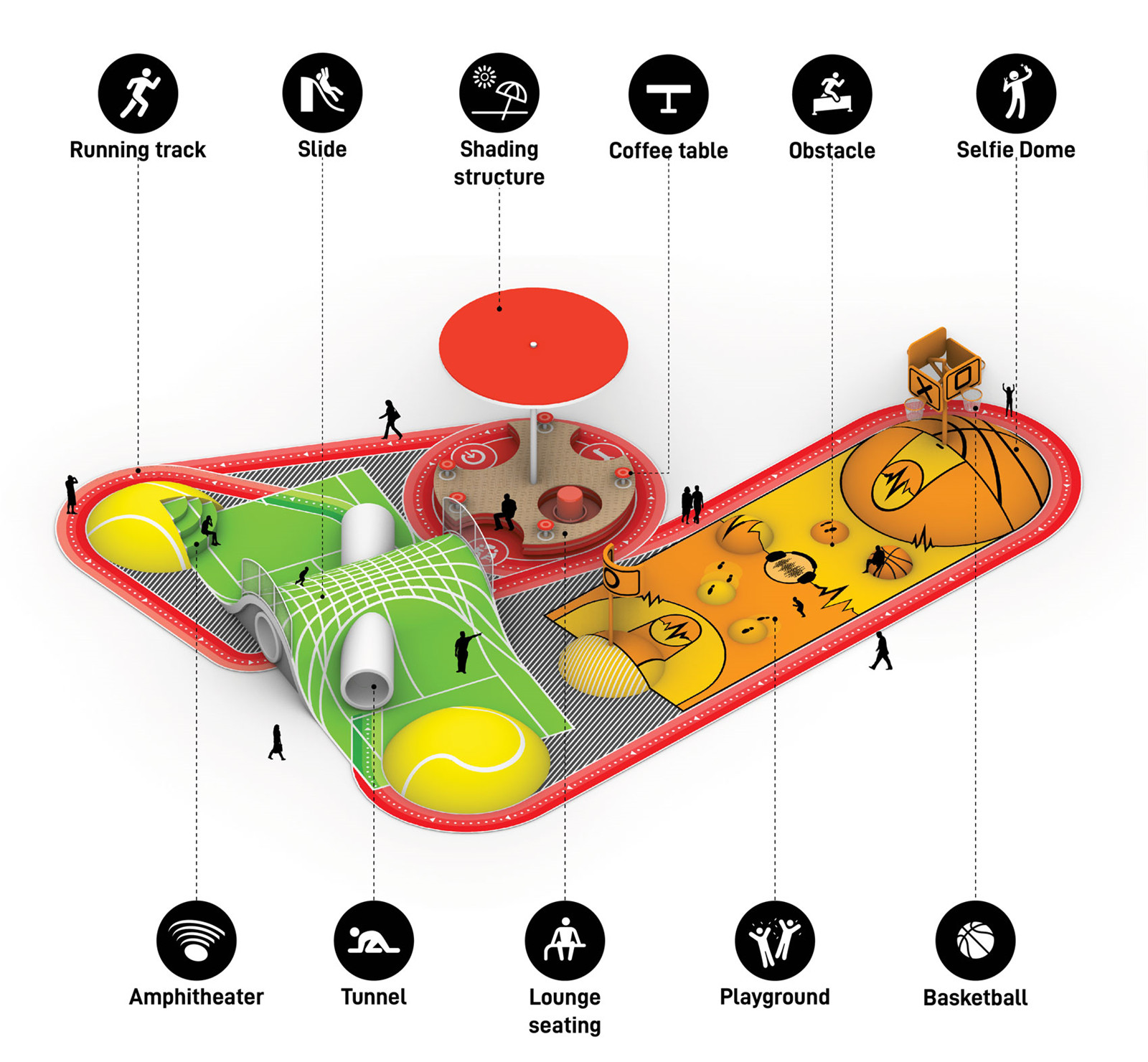 這些超現(xiàn)實的運動場通過跑道連接在一起,為孩子們提供玩耍的機會,以及通過在創(chuàng)新的“咬合”木板上提供休息的機會,成為公共家具以及成人和其他社會團體的聚會點,通過裝置促進社交互動。