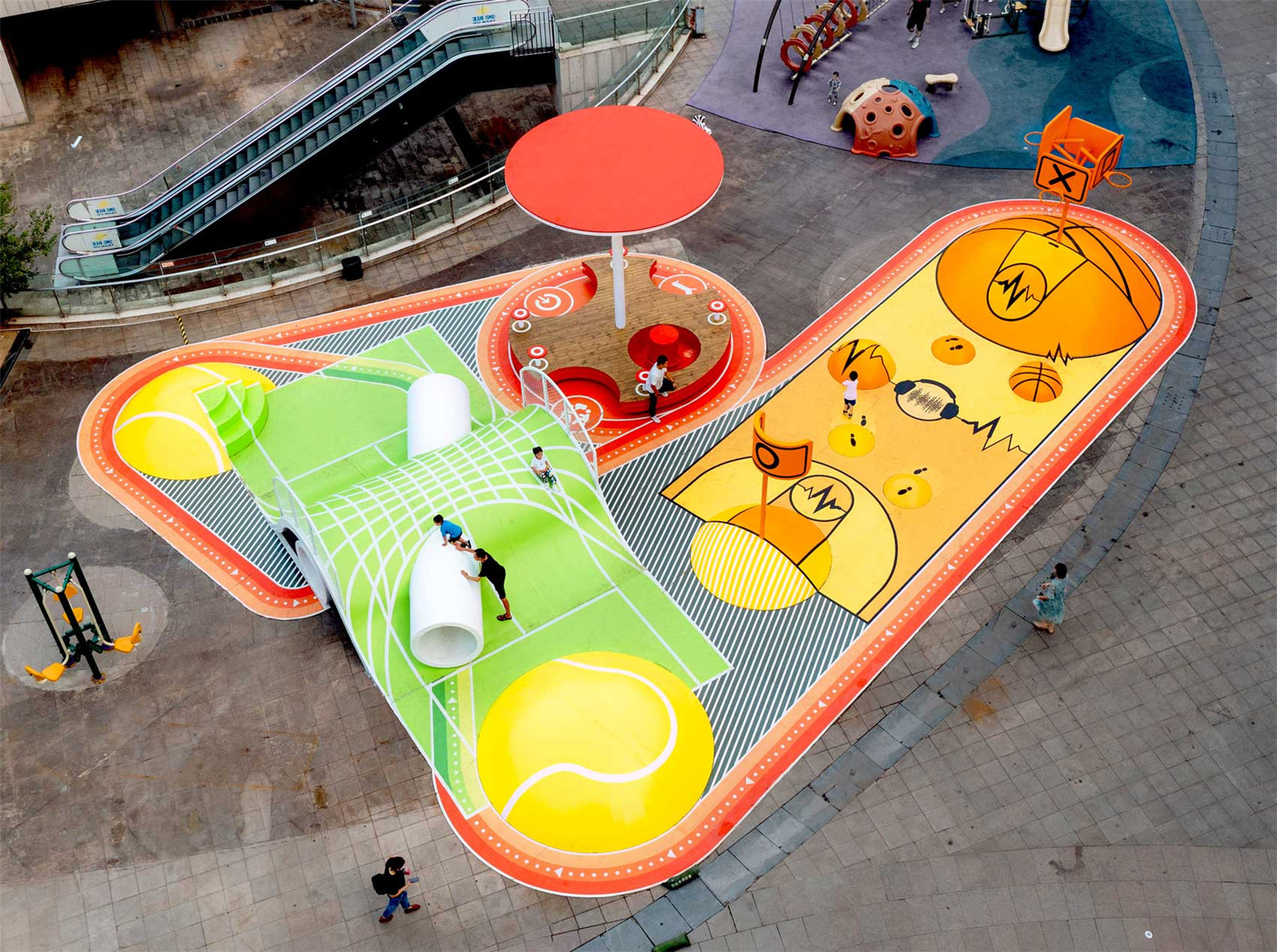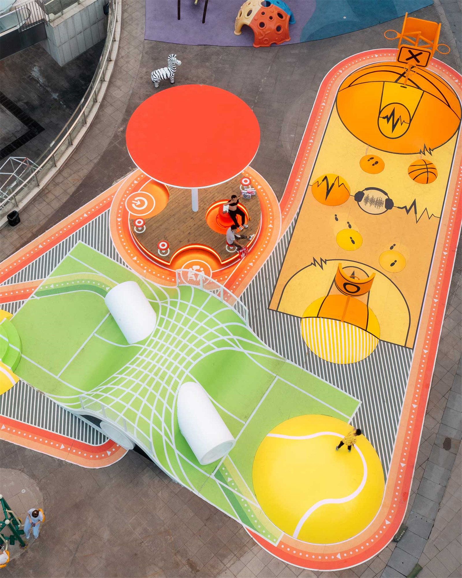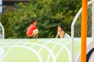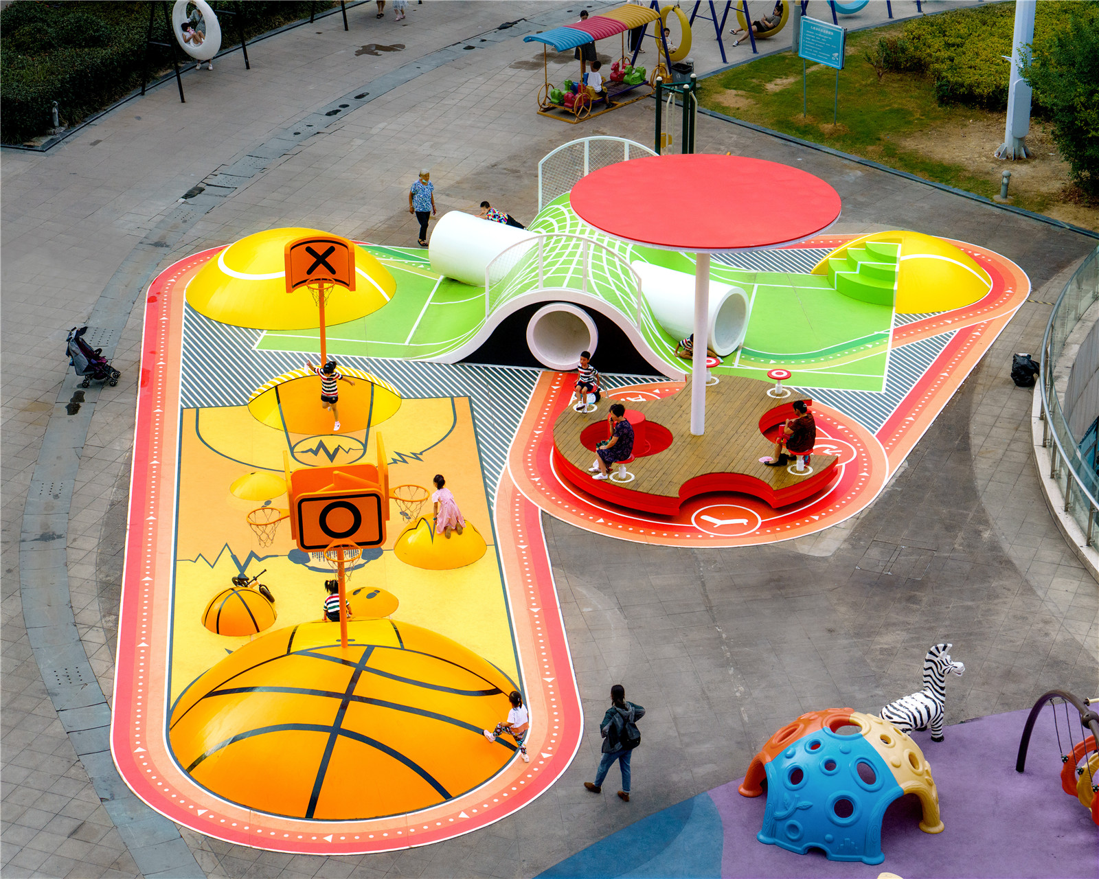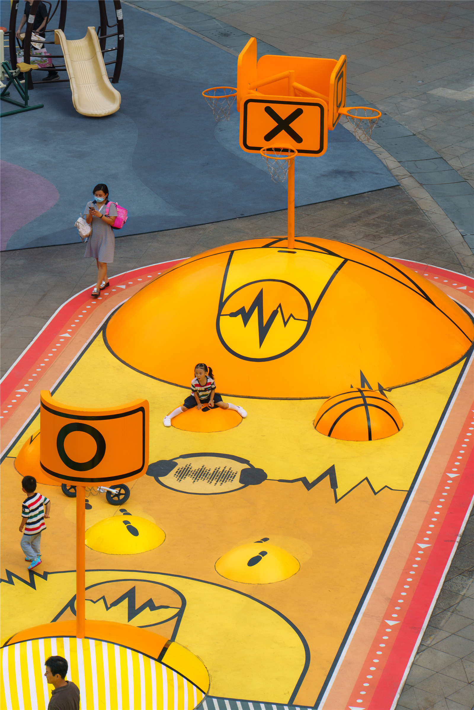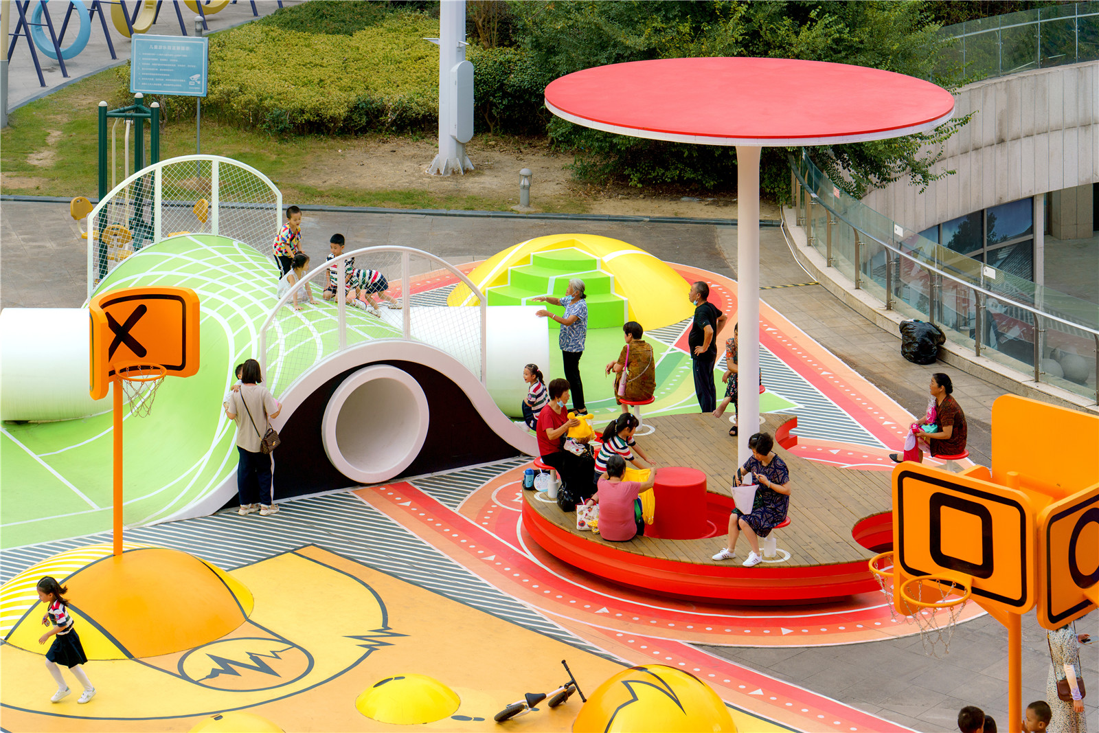 這些超現(xiàn)實的運動場通過跑道連接在一起,為孩子們提供玩耍的機會,以及通過在創(chuàng)新的“咬合”木板上提供休息的機會,成為公共家具以及成人和其他社會團體的聚會點,通過裝置促進社交互動。