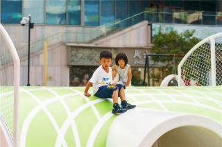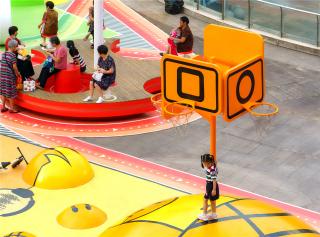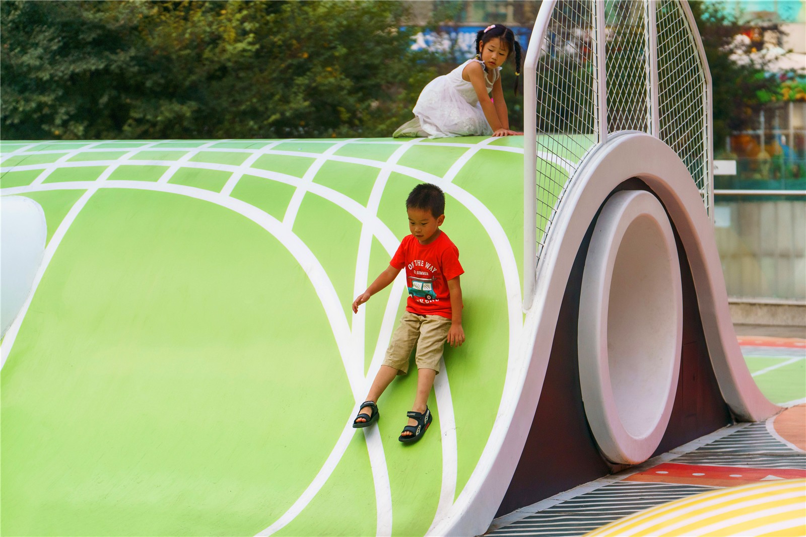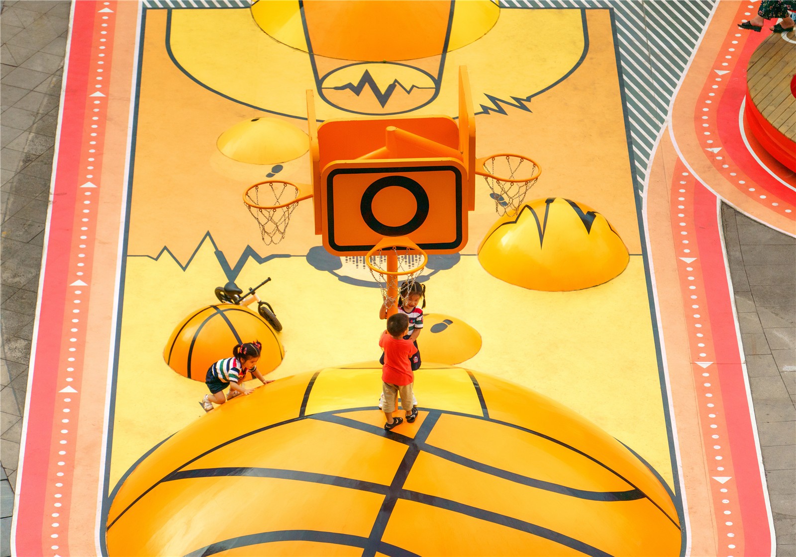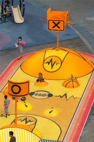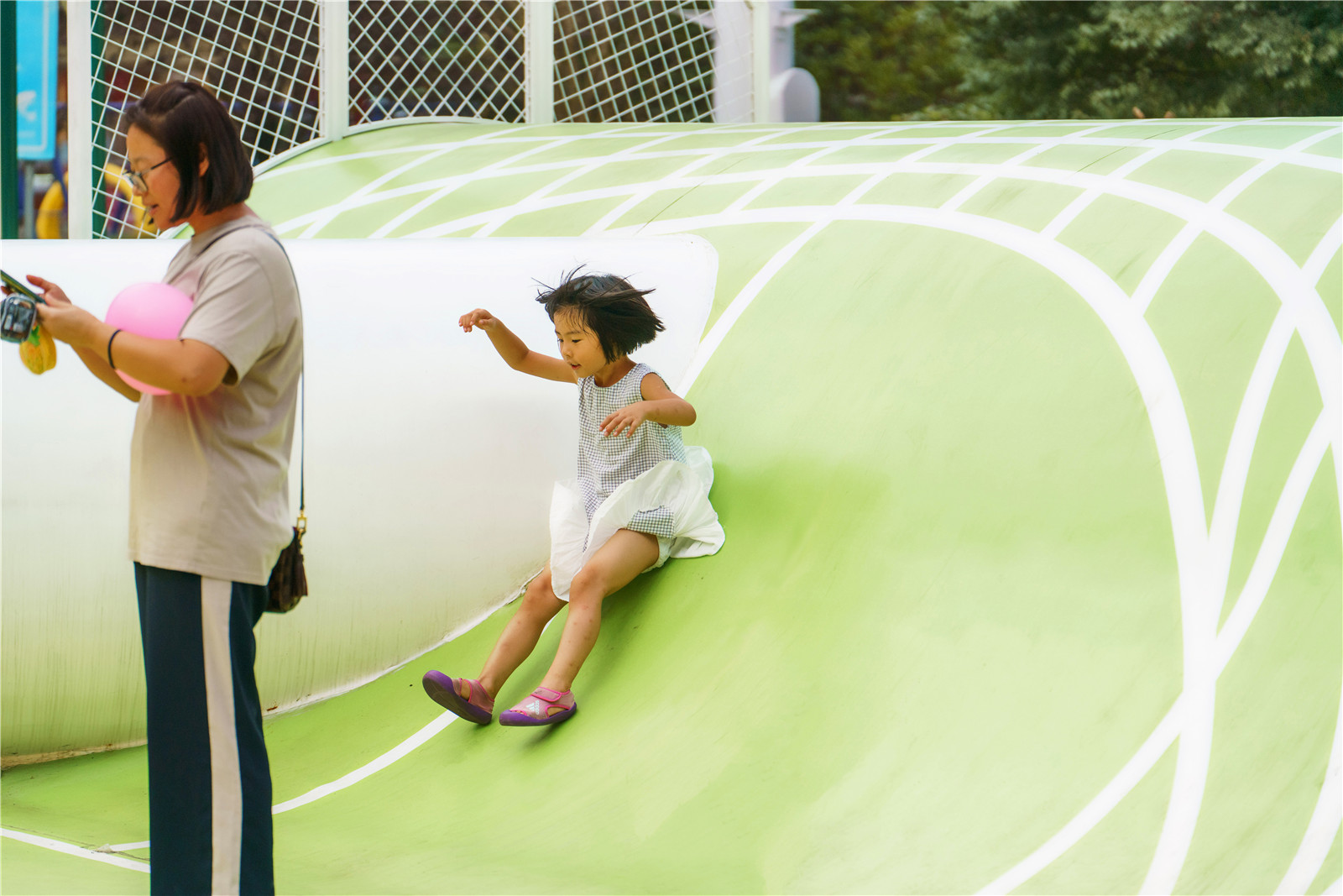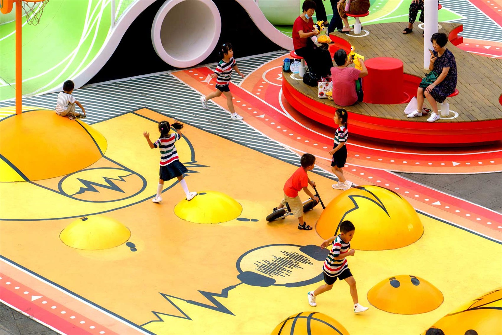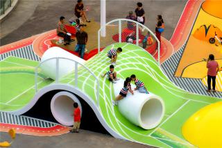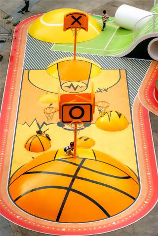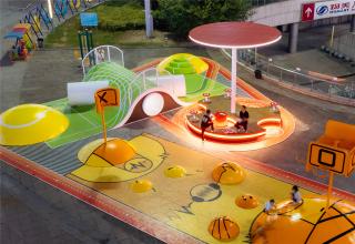 這些超現(xiàn)實的運動場通過跑道連接在一起,為孩子們提供玩耍的機會,以及通過在創(chuàng)新的“咬合”木板上提供休息的機會,成為公共家具以及成人和其他社會團體的聚會點,通過裝置促進社交互動。
