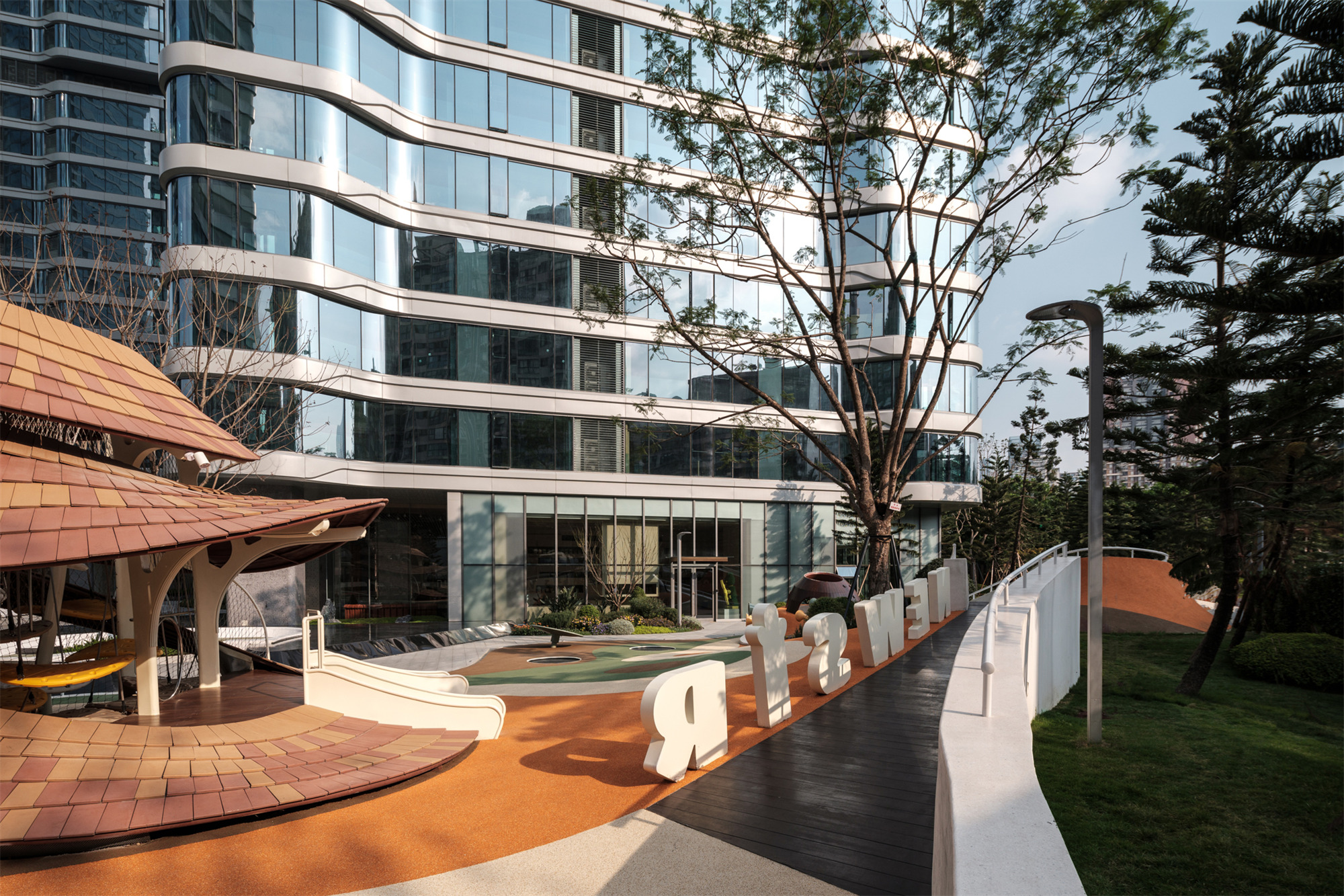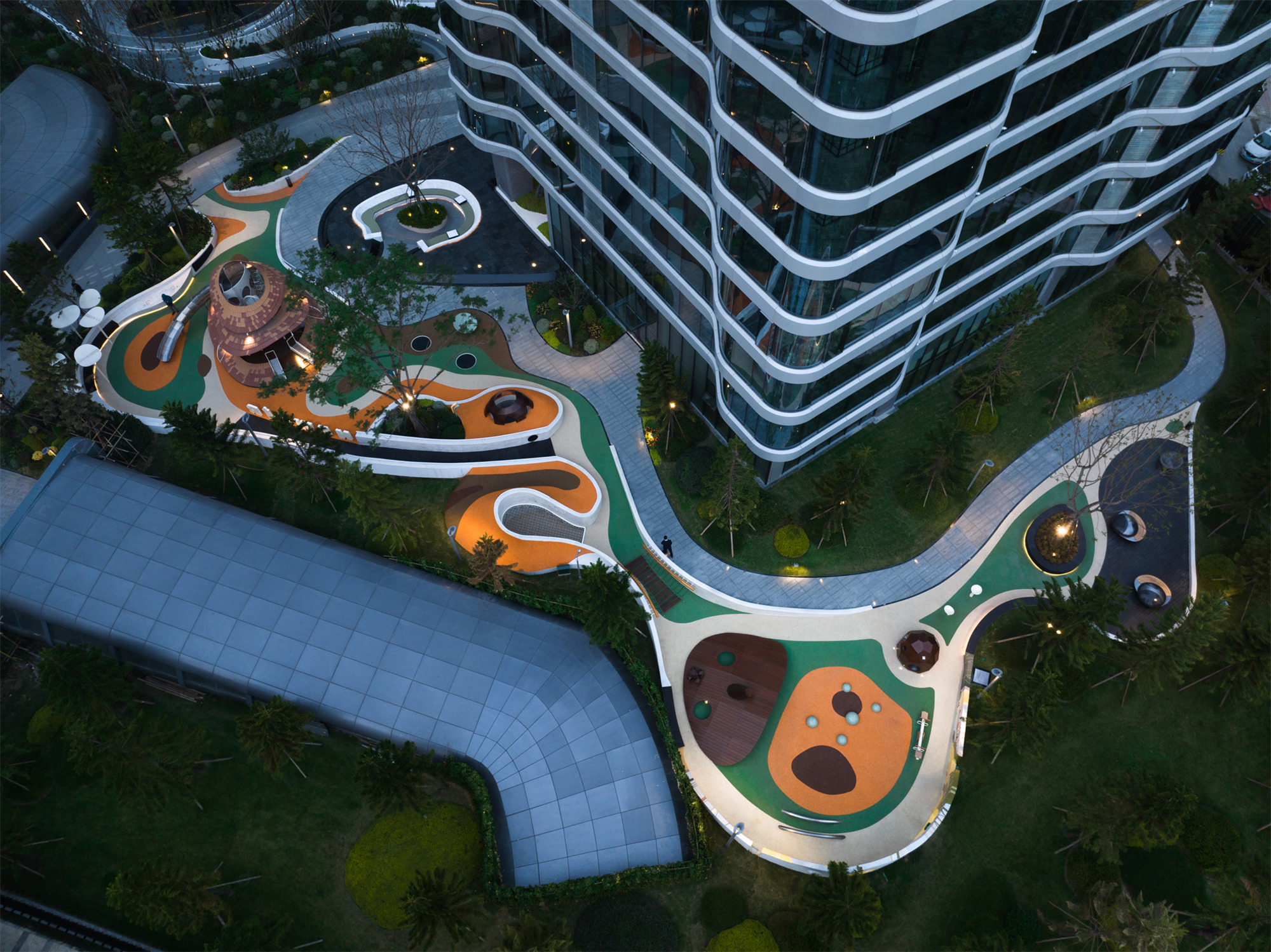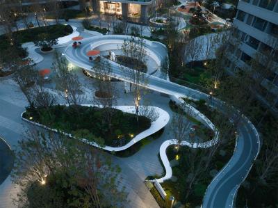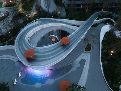 The mountainous elements are transformed into a layered waterscape, giving the space a rich sense of imagination and extension. The social space set in the waterscape brings unlimited freedom for neighborhood communication.