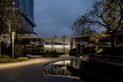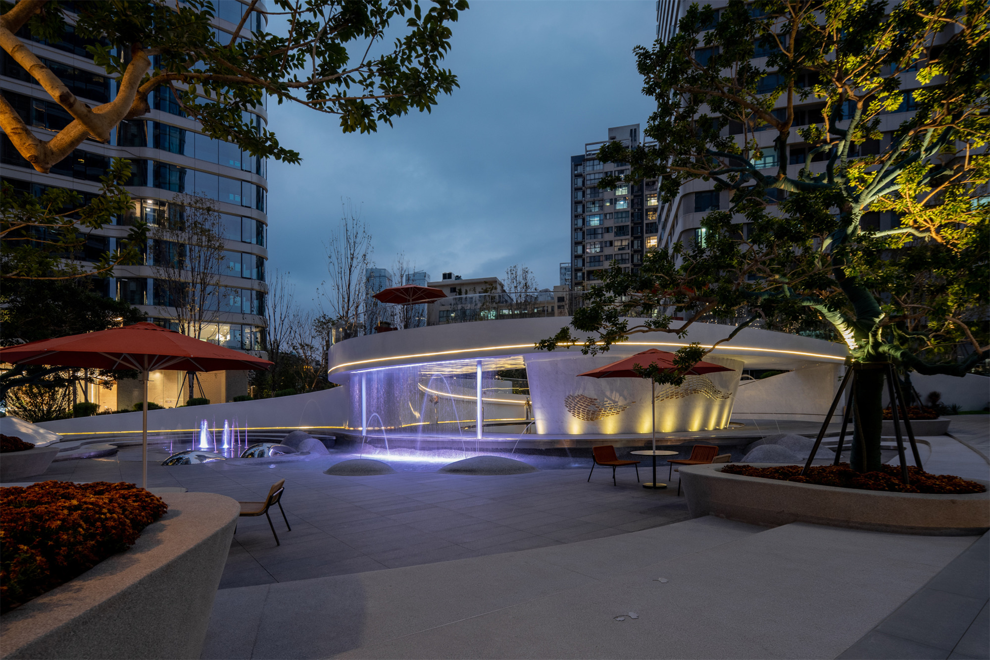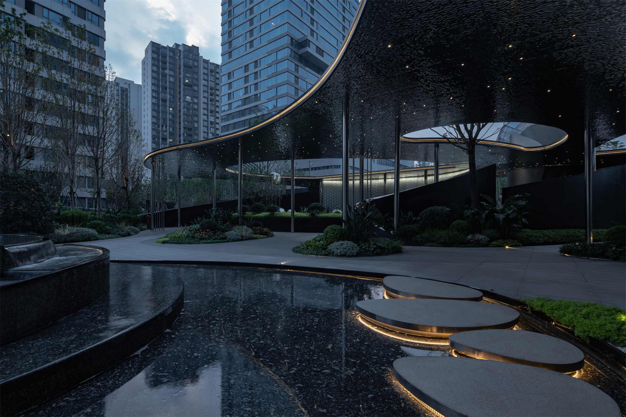 下沉式庭院為整體空間帶來充滿層次感的生機,設計以現(xiàn)代手法,結(jié)合當代生活,將空間與功能融合,營造出優(yōu)雅時尚的氛圍,水簾與建筑相融合,為空間增添了浪漫的藝術(shù)體驗。