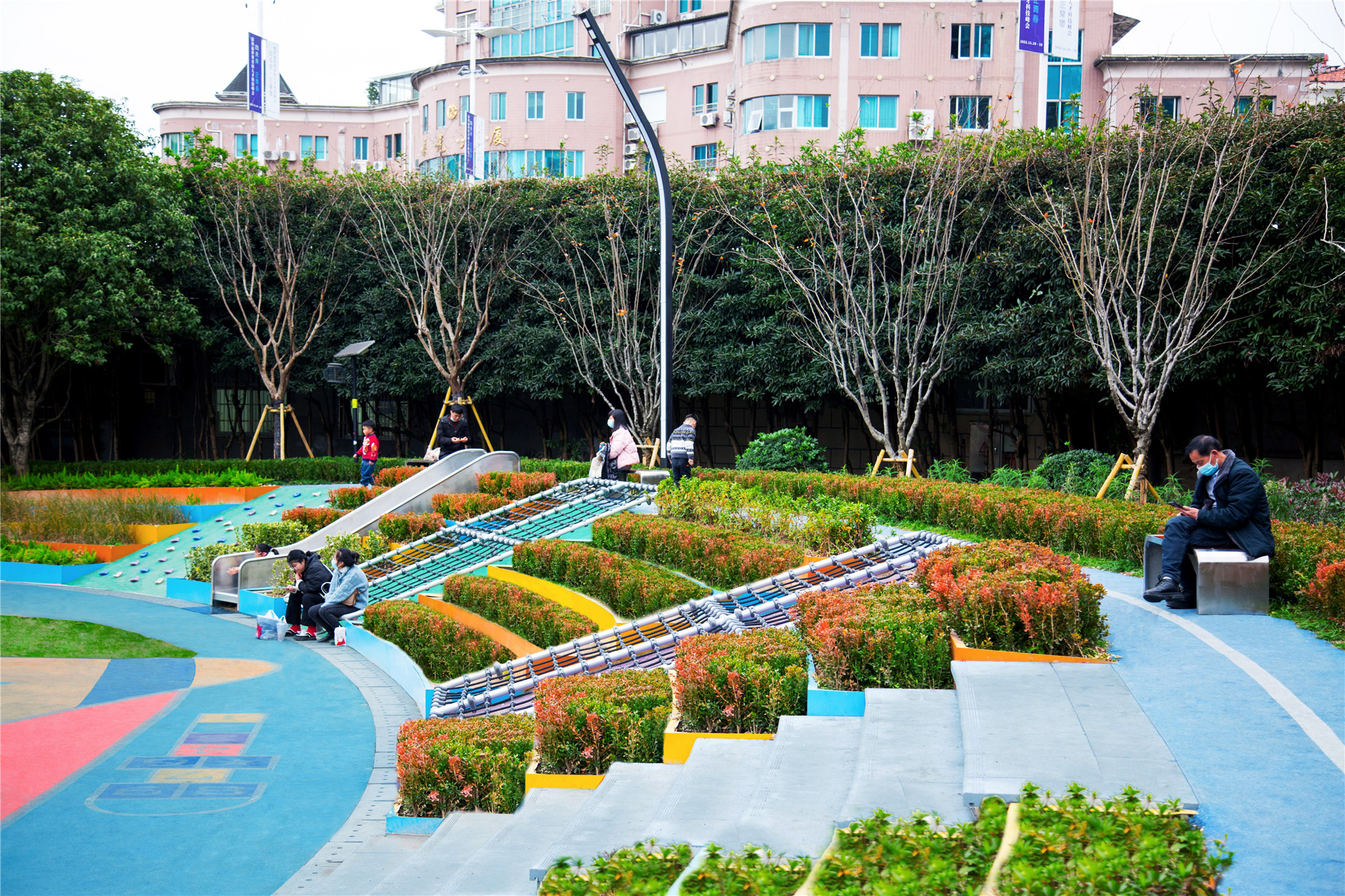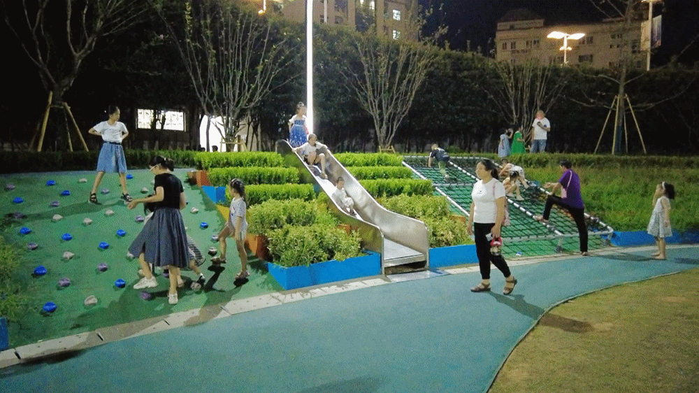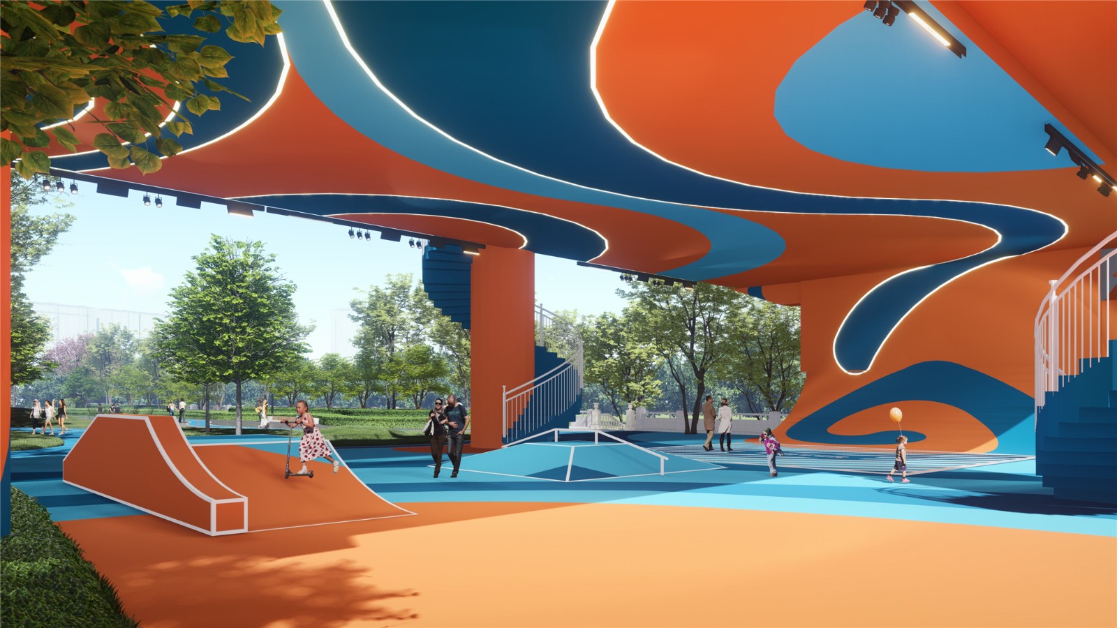 著力營(yíng)造下沉式活動(dòng)空間,通過(guò)地形的多樣化設(shè)計(jì),讓整個(gè)下層空間更具有層次感。賦予場(chǎng)地完善的基礎(chǔ)設(shè)施,并運(yùn)用線(xiàn)性鋪裝增加運(yùn)動(dòng)律感,以提升公園的功能性及互動(dòng)性,激活公園人氣,真正將場(chǎng)地演變?yōu)橐粋€(gè)積極、包容、多元化的空間,以吸納更多人群進(jìn)入空間,激發(fā)社區(qū)活力。