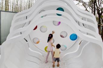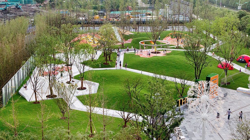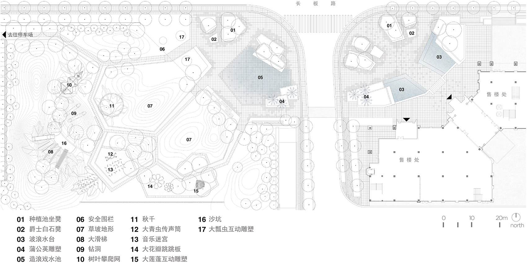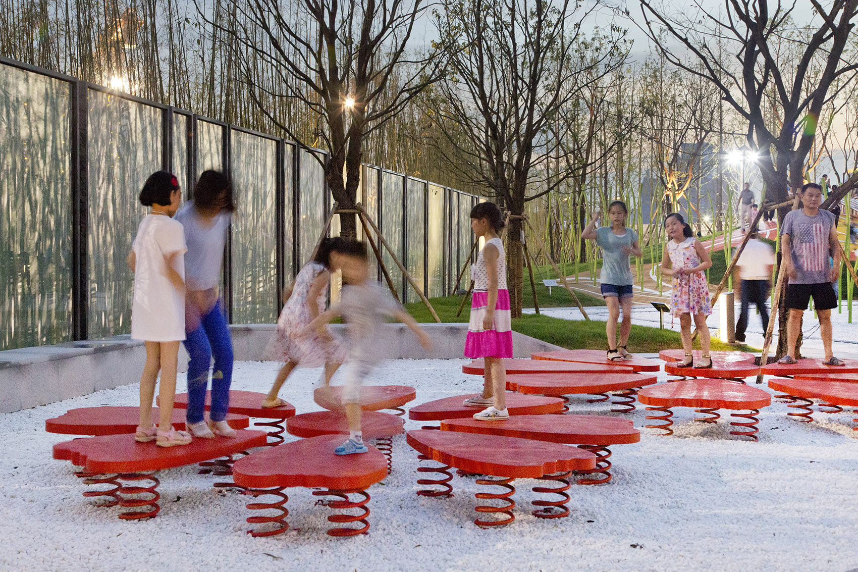 考慮到小公園是一個(gè)臨時(shí)場所,未來會被改造成商業(yè)用地,小公園內(nèi)主要由成本可控的波浪草坡和擁有許多可拆卸再利用的活動器械的兒童活動區(qū)構(gòu)成。白色礫石園路串聯(lián)了整個(gè)公園,與綠色的草坡相映成趣?;?、“樹葉”攀爬網(wǎng)、秋千、“花瓣”跳跳板、鉆洞和“大蓮蓬”、“青蟲說”等以自然元素為設(shè)計(jì)靈感的互動裝置或掩映在草坡之中,或安置在暖色的樹葉形塑膠地墊上。這些器械色彩明亮,提倡互動,引發(fā)人的聯(lián)想和探索欲,給孩子們營造了一個(gè)童話般的小世界。