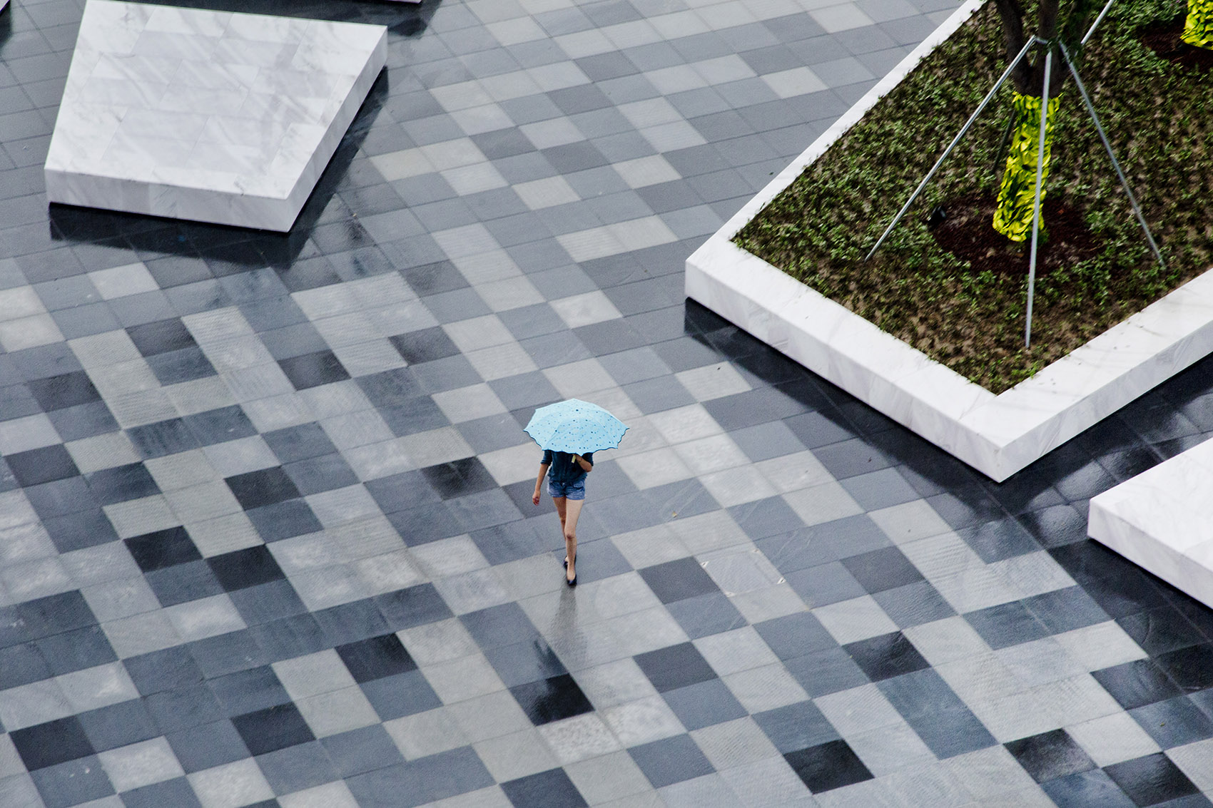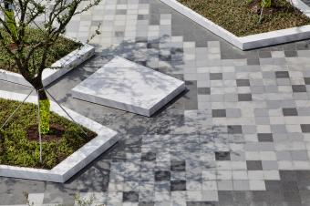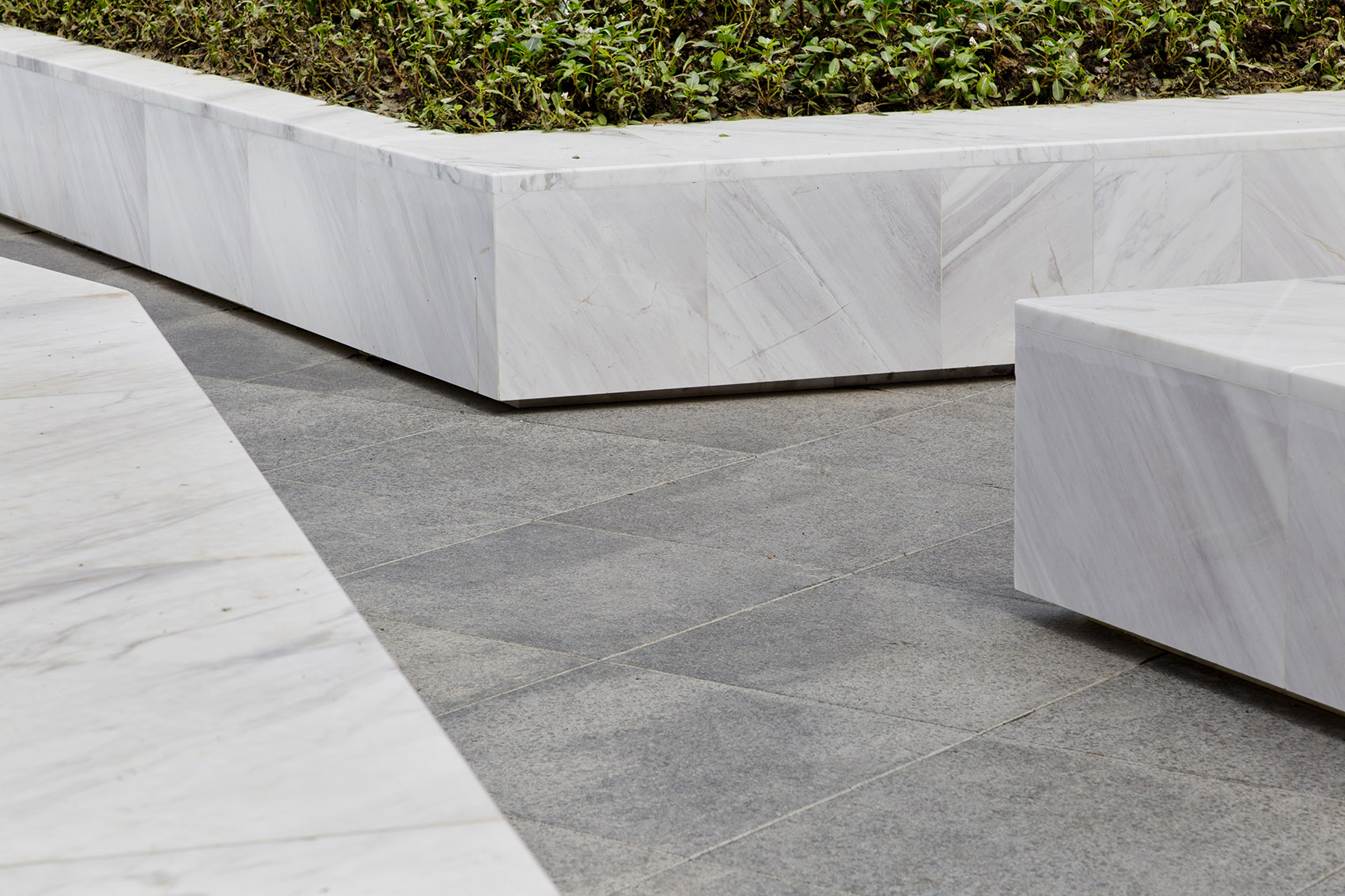 東西廣場均以緩坡與市政人行道相連,鋪裝也統(tǒng)一設(shè)計(jì)成600X600的正方形黑白灰三色跳色石材,這樣的處理方式模糊了場地和市政空間的界限,賦予了場地一個(gè)友好的對外界面。廣場由幾組大型花池組合圍合出中央活動空間,花池采用了光面爵士白花崗巖,在陽光下,亮白色的石材耀眼而優(yōu)雅?;ǔ叵路降匿佈b采用福鼎黑花崗巖,與爵士白花崗巖形成鮮明的對比,更突出了白色花池的亮度。