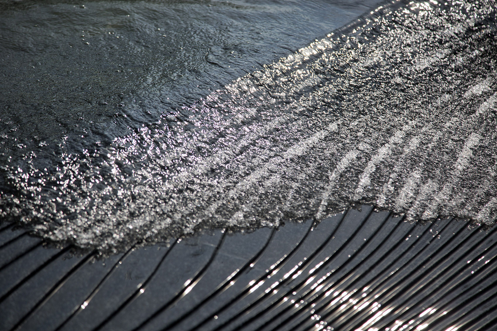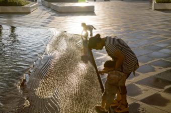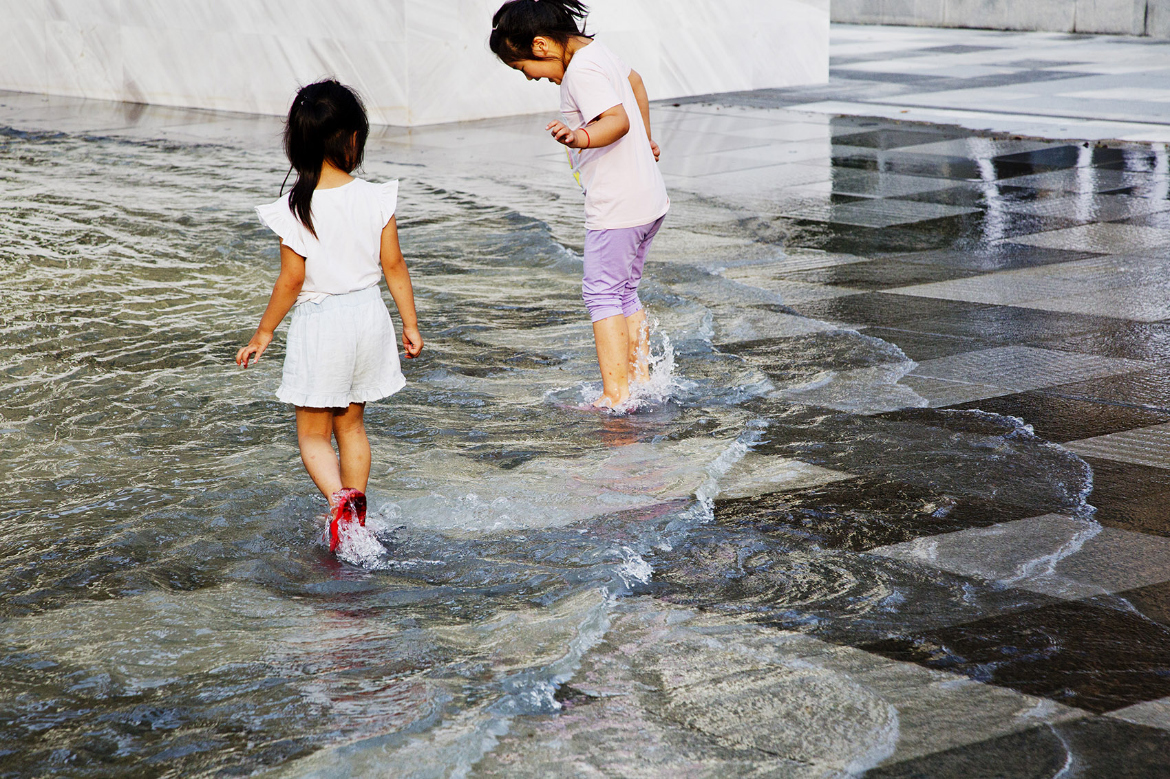 西廣場設(shè)置了一處面積約300m2的地面波浪戲水池,意圖在城市廣場上創(chuàng)造一個(gè)模擬自然海灘的景觀元素?!昂@恕睆碾[藏在爵士白樹池側(cè)壁上的出水口噴涌而出,逐漸減弱,然后慢慢退回來。在營造互動性場所的同時(shí),改善小氣候,帶來一絲涼意。