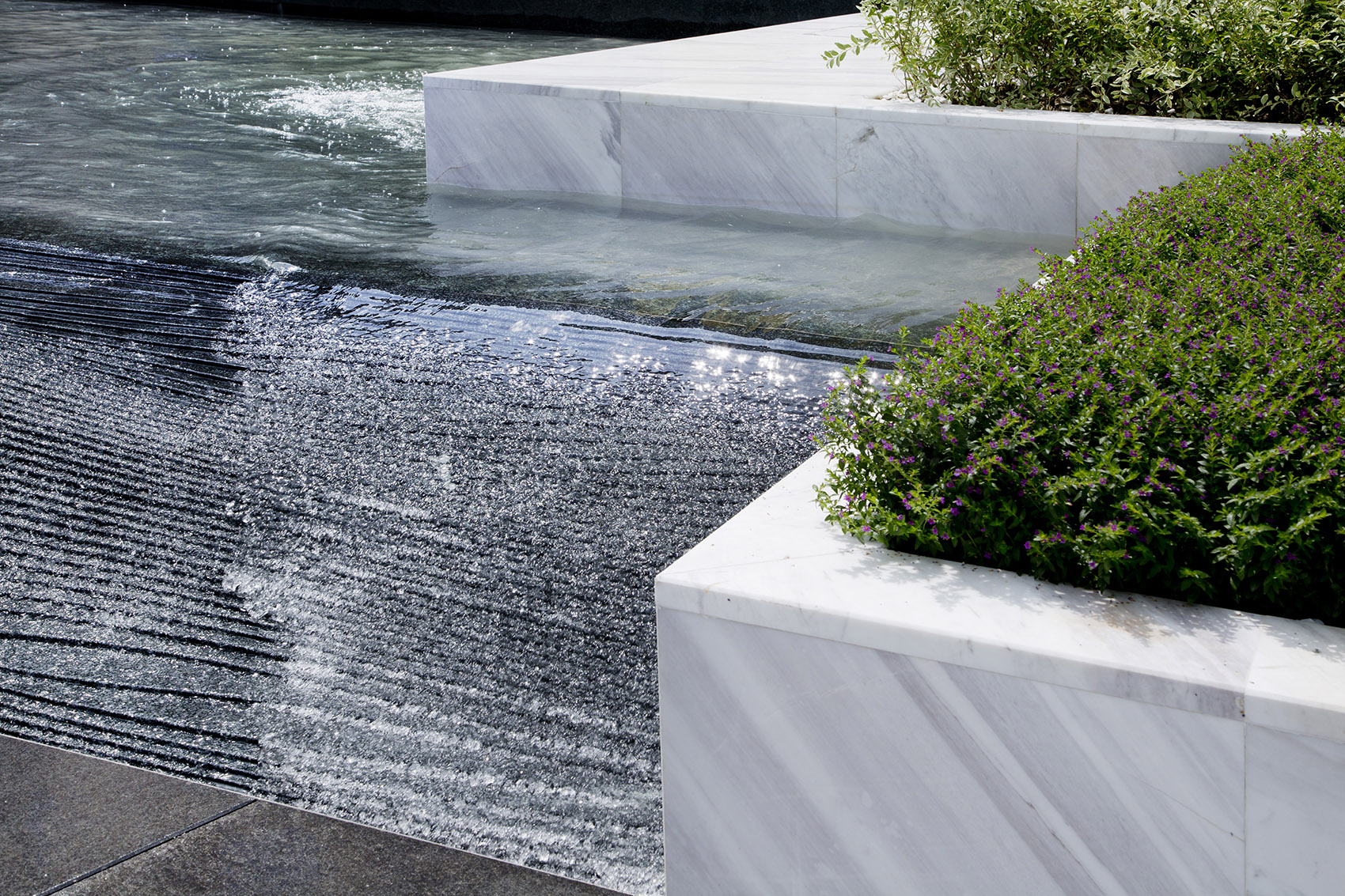東廣場售樓處入口前設(shè)置了兩個(gè)翅膀狀的波浪水臺,一方面消解了售樓處建筑與廣場之間的高差,另一方面由造浪機(jī)推出的一陣陣波浪不僅給水臺增添了視覺上的動態(tài)效果,波浪拍打池壁時(shí)產(chǎn)生的聲響也帶來了聽覺上的享受。水臺側(cè)邊的花崗巖雕刻成隨機(jī)的等高線狀(張?zhí)扑囆g(shù)工作室設(shè)計(jì)制作),波浪溢過其上,產(chǎn)生了大小不同、前后不一的水花,陽光照射過來,波光粼粼,伴隨著“嘩嘩”的流水聲,營造了一種寧靜優(yōu)雅的氛圍。