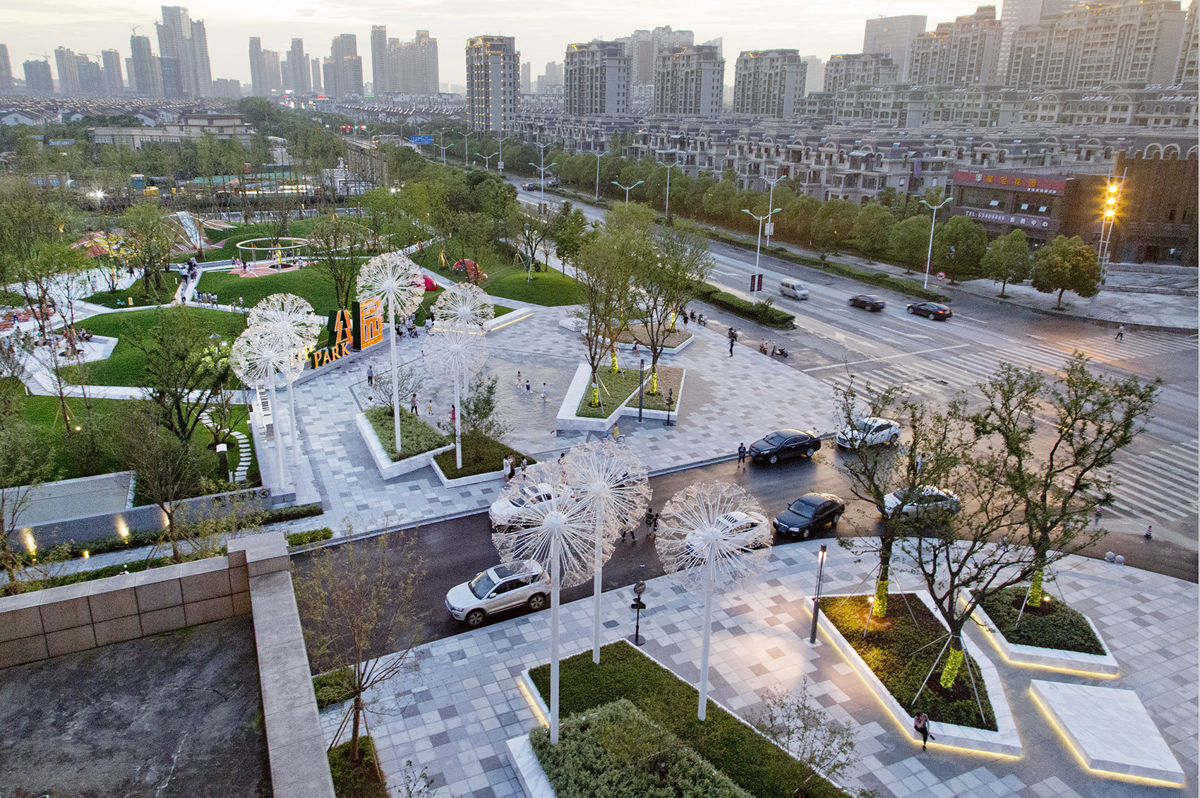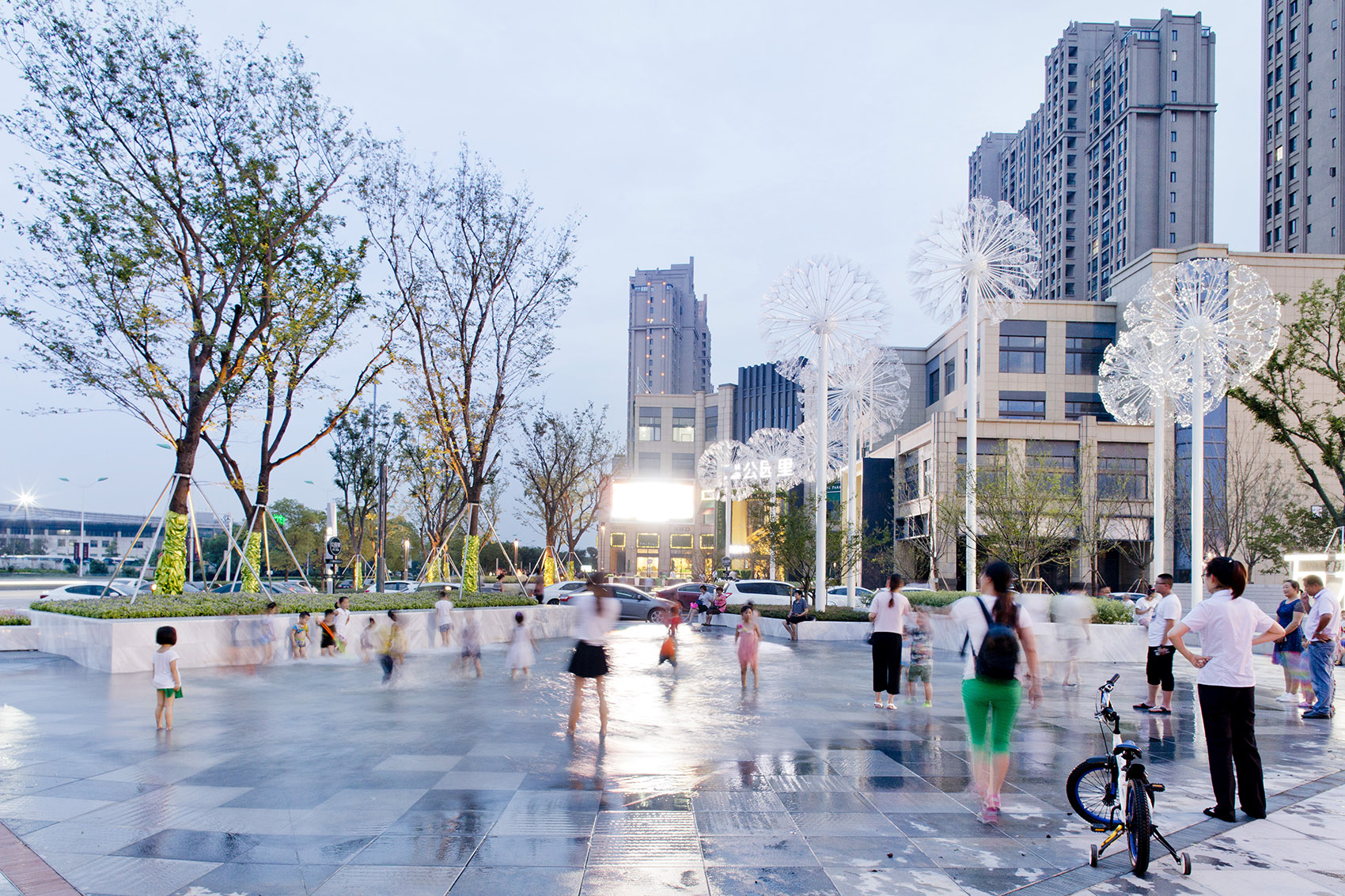 東、西街角廣場之間是通往住宅區(qū)內(nèi)部的車行道,一組由8個(gè)高達(dá)10m左右的蒲公英雕塑構(gòu)成的雕塑群強(qiáng)調(diào)了入口,也成為了場地上地標(biāo)性的元素。