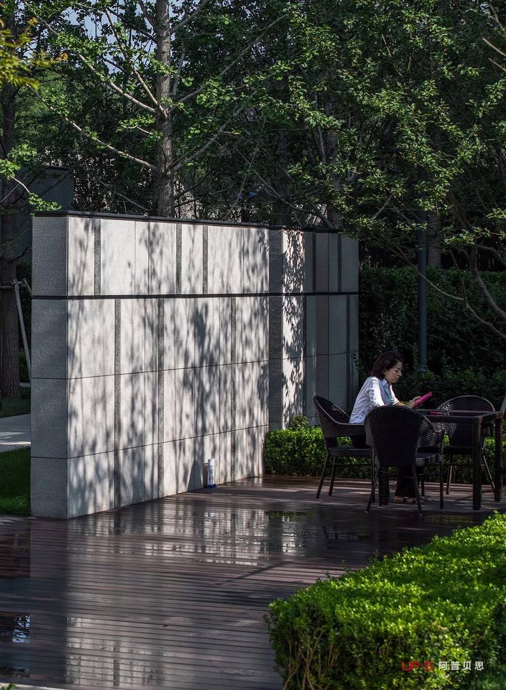 二進(jìn)院落則以“墻”為設(shè)計(jì)理念,通過(guò)1.8米的黃楊綠籬與2.5米的水景墻將空間劃分為方正的空間感,實(shí)景部分是綠化與景墻形成的層次關(guān)系,虛景部分則徹底放空,點(diǎn)植玉蘭與海棠,傳承北方庭院中玉堂富貴之寓意;
