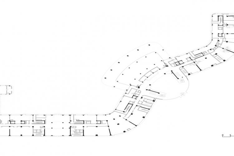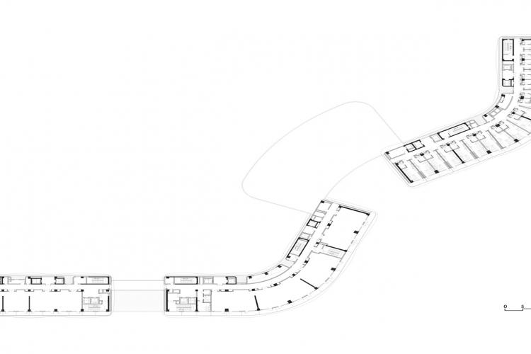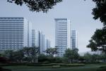 養(yǎng)生養(yǎng)老公寓呈線性布局,所有房間沿海岸展開,充分利用佛光海景資源,打造一線海景觀賞面,同時保證充足的采光日照。5幢住宅圍繞中心花園設(shè)置,相互錯位構(gòu)建層次豐富、收放有致的開放空間格局,最大化中心景觀空間,形成由海面向陸地延伸的通透視線廊道,最大化擴展各個樓棟的觀海視野。