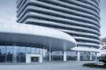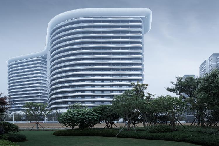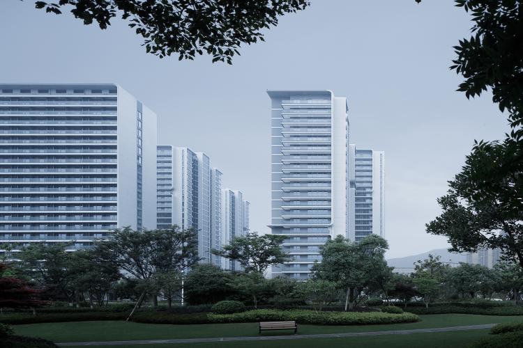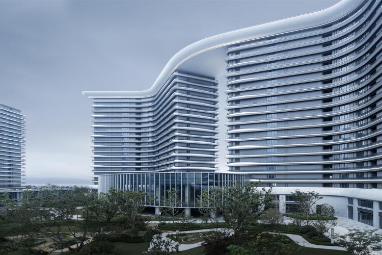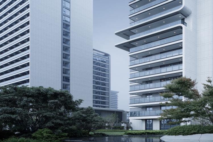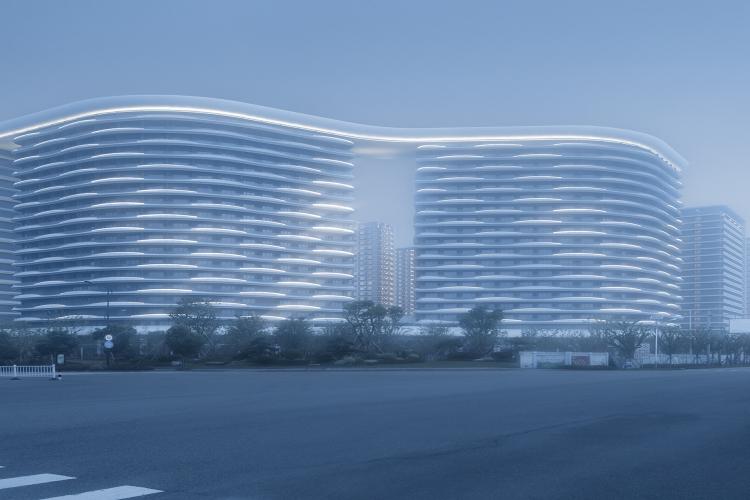 住宅整體效果凸顯公建化立面特色,利用弧型折板、“C”型飄板造型、大玻璃面等元素,詮釋舟山獨特的海洋文化,打造簡潔清爽、海洋風(fēng)情的舟山濱海住宅形象標(biāo)桿。每棟住宅的折板造型上下錯動,起伏變化,展現(xiàn)同一造型元素下的不同建筑表情,體現(xiàn)“和而不同”的空間構(gòu)建核心理念。迎合當(dāng)下流行的現(xiàn)代精致、文化內(nèi)涵的居住理念,也契合居住者對舟山地緣情懷的企盼。