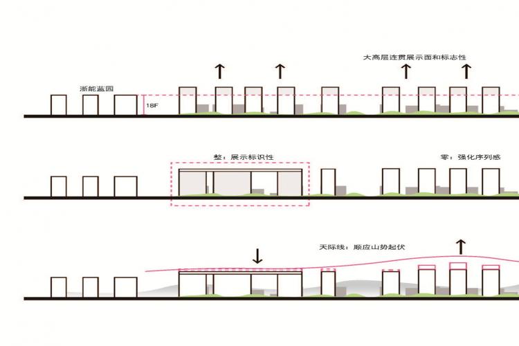 對東港新區(qū)已建成區(qū)域的濱海界面空間節(jié)奏進行剖析,將項目打造為東港新地標(biāo)。采用全高層沿海布局,拉高建筑單體高度強化界面的連續(xù)性與序列感。養(yǎng)生養(yǎng)老公寓屋頂相連,形成標(biāo)志性建筑群組。順應(yīng)連綿遠山走勢,營造起伏的濱海天際線。依山海之形,構(gòu)磅礴之勢。
