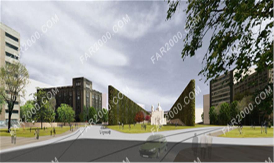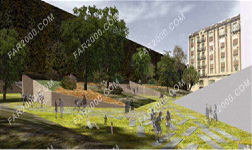 廣場的內(nèi)部空間是自由和流暢的,人行道上基本沒有樹木;而外圍空間大樹成蔭并點綴著一些不規(guī)則的景觀和建筑片段,并設置了各個通向內(nèi)部空間、聚會點和活動區(qū)的入徑。周圍的花園成為城市生活和廣場之間的一個緩沖帶。中間的地帶長500米,高度有18米,種滿了各種植物,色彩繽紛,不斷在四級改變著綠墻的形象。隨著歲月流轉(zhuǎn),該項目的幾何形狀也會有不可預測的變化。