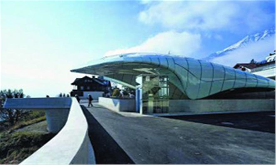 出站口的玻璃頂棚十分的“哈迪德”,流線型的不規(guī)則白色造型,讓人無(wú)法忽視它的存在。為了設(shè)計(jì)這個(gè)車(chē)站,乍哈·哈迪德專門(mén)做了很多有關(guān)冰川、冰磧等的研究,從而我們才可以達(dá)到一個(gè)既有鮮明的建筑師風(fēng)格,又與自然景觀融為一體的車(chē)站:車(chē)站出站口的基座可以被看作冰磧,也就是連接大地和冰川的那個(gè)部分;而其上的頂棚則可以被看作冰川——一座被融化的雪水雕刻成的大自然紀(jì)念碑。
