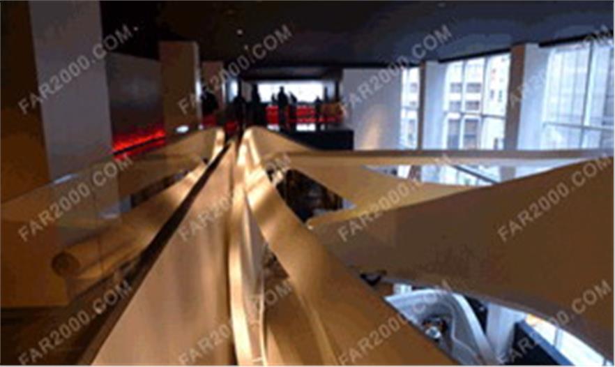 商店位于第五大道和第56大街交匯處的兩座建筑的頭三層。除了地下室,展示廳位于四個不同層次上,其核心點(diǎn)是一座連接各層的樓體。樓體用輻射狀的鋼格板構(gòu)成,表面用雕塑形狀鋪設(shè)了塑料。這是一個彎曲獨(dú)立的要素,既可以構(gòu)成復(fù)雜的形狀,也可以構(gòu)成簡單的幾何輪廓,就像是充滿了極大動感的旋風(fēng)一般。周圍則全部是阿瑪尼的世界。