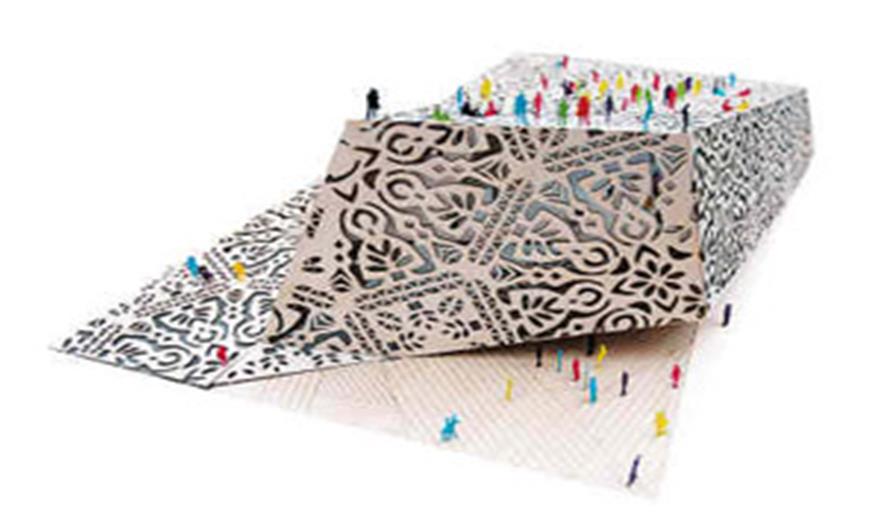 由3位波蘭建筑師設計的展館是一座獨特建筑,其外形明確地讓人聯(lián)想到波蘭民間剪紙作品,好像在剪紙之前經過層層折疊的一張紙。入夜時展館彩色燈光穿透剪">