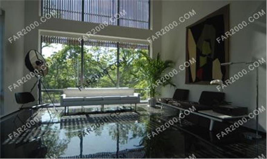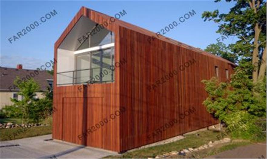 建筑外墻用垂直的木質(zhì)雨幕建成。而這座2500平方英尺的住宅容納了四間臥室、兩間半浴室,西墻通過(guò)遮光板滲透進(jìn)日光,透過(guò)絕緣用的卷板可看到一片樹林。