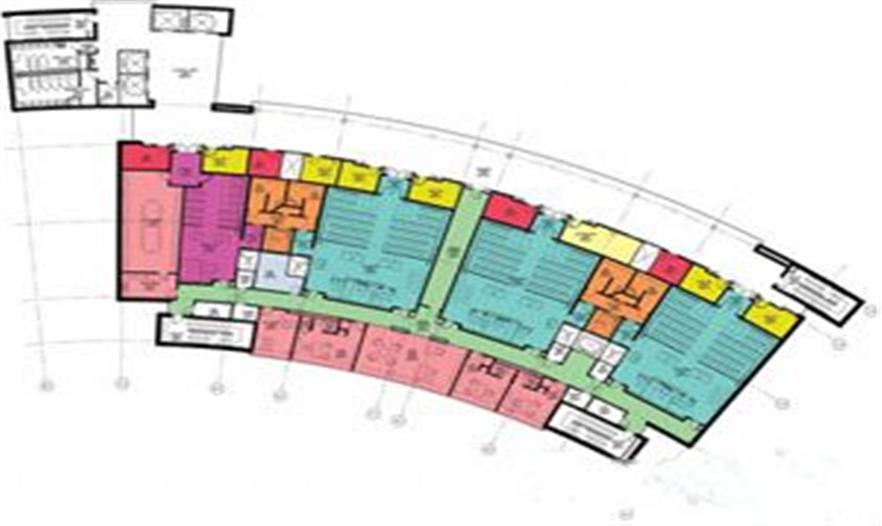 垂直的玻璃條帶將建筑分隔成三個主要部分,減少了單體建筑的沉重感。建筑的第一層是入口處、接待處和監(jiān)禁室、專員套房以及行政辦公室;第二層是管理部門所在地;第三層幾乎都是公設辯護律師辦公室;第四層是三種標準法庭和稍大一點的交通法庭;第五層是三座法庭和兩間聽證室;第六層是兩座法庭、兩間聽證室和一座多功能室。三到六層都可以進行重新布局,最多可容納16座法庭。