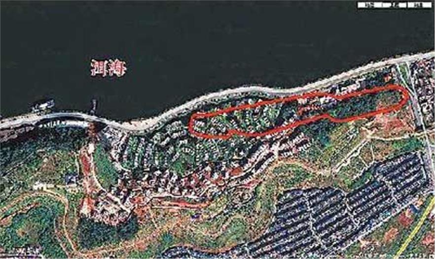 谷歌衛(wèi)星地圖,圖中紅線框內(nèi)為情人湖原址,現(xiàn)已被填埋。從衛(wèi)星圖上可以看到,情人湖原址及其周邊洱海公園的大片臨湖區(qū)域,已經(jīng)建成了較大規(guī)模的高檔別墅區(qū),附近還有一些尚在施工的工地。
