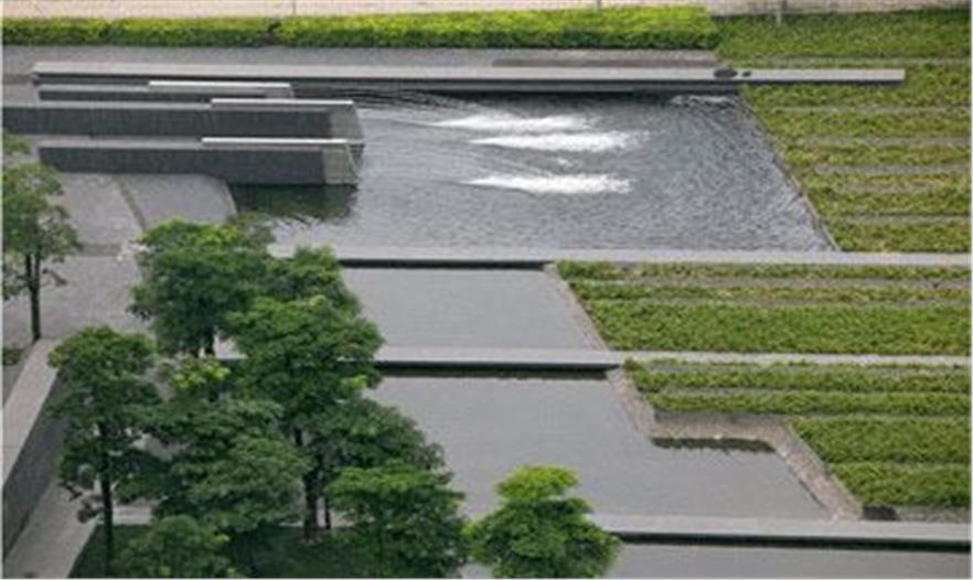 為了回應(yīng)顧客對(duì)中式花園的要求,中心花園的設(shè)計(jì)中應(yīng)用了典型的中式花園的氣息,陰與陽,順序與排列等。在花園里,線性的噴泉被做成玻璃槽,這樣,光線就能夠通過它們進(jìn)入下面的展示空間,而木平臺(tái)和樹陣則成為了聚會(huì)的場(chǎng)所。