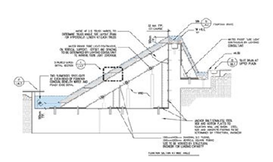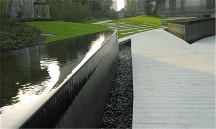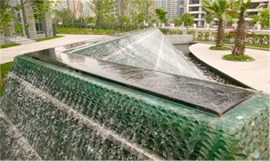 位于一個繁忙的十字路口的拐彎處,很好的對公眾展示了花園的形象。這個花園的設(shè)計是以河流的基礎(chǔ)設(shè)計建設(shè)為特點的。每年這里都會有洪水漫上河岸,它徹底的改變了人們與河濱的關(guān)系。這個花園模仿了這一事件,創(chuàng)造了2.5米的堆疊似的玻璃噴泉,瀑布的水流緩緩流下,廣場上還提供可以觀看這一水景的座位。