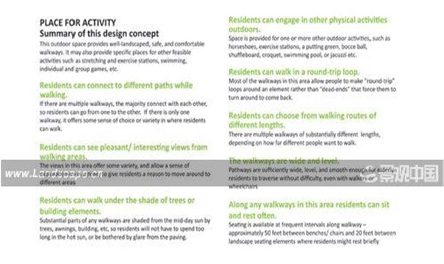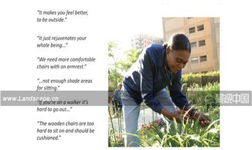 評(píng)語(yǔ):“如果在所有活動(dòng)中融入景觀設(shè)計(jì),那么許多特點(diǎn)都是非常有益的,這將產(chǎn)生優(yōu)秀的設(shè)計(jì)并為所有人提供卓越的體驗(yàn)。改善我們與世界的關(guān)系,那么圍繞我們的就是更好的精神健康!與老年人談?wù)摼坝^設(shè)計(jì)的細(xì)節(jié),證明了景觀設(shè)計(jì)師的重要。它設(shè)定了需要證明的假設(shè)——適用于所有老年人的設(shè)計(jì)也適用于每個(gè)人。這項(xiàng)研究具有更廣泛的應(yīng)用而不僅僅只是在老年人身上?!?