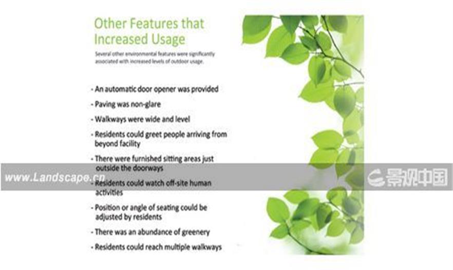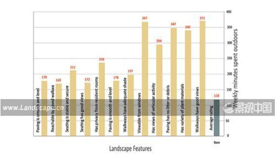 研究概述: 本研究評(píng)估了景觀設(shè)計(jì)如何影響輔助生活設(shè)施的戶外使用。在評(píng)估了68個(gè)多樣化環(huán)境里的設(shè)施隨機(jī)取樣,并調(diào)查了1560個(gè)居民和工作人員之后,一經(jīng)發(fā)現(xiàn)有幾個(gè)景觀特色和戶外使用有著緊密聯(lián)系。由于人們認(rèn)為和大自然接觸有著顯著的健康益處,信息全面的景觀設(shè)計(jì)師從長(zhǎng)遠(yuǎn)的角度來(lái)說(shuō),可能有助于體弱長(zhǎng)者的健康改善。