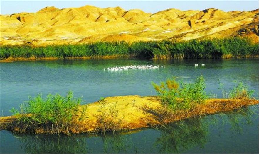 你能想象這是在寸草不生的荒漠中拍到的鏡頭嗎!這片位于塔里木油田克拉2氣田的人工濕地水表面積1.63萬平方米。