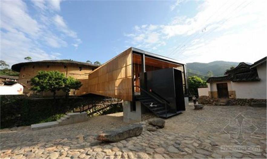 建筑從功能和形式語言上為兩座土樓創(chuàng)造了連接,同時也聯(lián)系并重新組織了周邊的空地,為村落提供了很好的公共廣場,廣場一邊是圓形的帶有粗糙痕跡的土樓,另一邊是精致簡練的舞臺,對話雙方的強(qiáng)烈對比使整個空間充滿了張力。每逢傍晚和夜里,這里就聚集了村里自發(fā)活動的人群。這樣的設(shè)計(jì)不僅為孩子們提供了學(xué)校教室,解決了交通聯(lián)系問題,而且為整個村帶來了交流的中心。