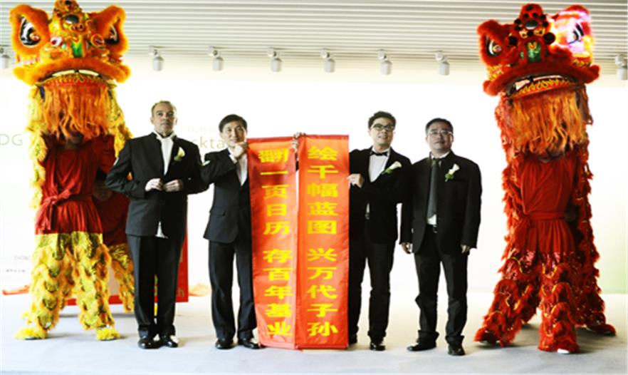 新聞發(fā)布會后,與會者魚貫來到答謝會的主會場。設(shè)計(jì)作品展板錯落有致地懸掛于會場前后,向來賓們展示泛亞國際不同類型的設(shè)計(jì)作品,訴說30年的發(fā)展歷程。來賓們饒有興致地參觀并不時自由交流。在主持人介紹本次活動出席的嘉賓后,泛亞國際董事長劉興達(dá)先生、中泰照明副總裁蔣加珍女士、泛亞中國區(qū)首席代表田明先生、泛亞國際執(zhí)行總監(jiān)Michael、圖書出版方鳳凰空間副社長石瑩、泛亞國際總裁陳奕仁先生先后發(fā)表了致詞,期間穿插的沙畫表演向來賓們詮釋了“讓環(huán)境更美好”的主題,而舞獅表演更是將整個會場的氣氛推向高潮。在泛亞國際四位高層為舞獅點(diǎn)晴之后,印有“匯千幅藍(lán)圖興萬代子孫,翻一頁日歷成百年基業(yè)”的對聯(lián)也從獅子口中魚躍而出,大家舉杯共同祝愿泛亞國際的事業(yè)蒸蒸日上。最后,隨著泛亞國際高層揭開《居里空間》、《城設(shè)維度》這兩本新書的神秘面紗,并為泛亞的新網(wǎng)站一并做了揭幕,此次活動再次掀起高潮,取得了圓滿成功。
