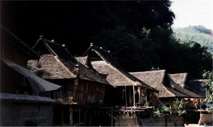 房子都是單幢,四周有空地,各人家自成院落。騰龍沿邊的住宅,多土墻平房,每一家屋內(nèi)一間隔為三間,分臥室客堂,這顯見是受漢人影響,已非傣族固有的形式;思普沿邊則完全是竹樓木架,上以住人,下棲牲畜,式樣皆近似一大帳篷,這與《淮南子》所記“南越巢居”的情形完全符合,也正是史書所記古代僚人“依樹積木以居”的“干欄”住宅。土司頭人的住宅,多不用竹而以木建,式樣仍似竹樓,只略高大,不鋪茅草而改用瓦來蓋頂。西雙版納境內(nèi),傣族自己能燒瓦,瓦如魚鱗,三寸見方,薄僅二三分,每瓦之一方有一鉤,先于屋頂椽子上橫釘竹條,每條間兩寸許,將瓦掛竹條上,如魚鱗狀,不再加灰固,故傣族屋頂是不能攀登的,若瓦破爛需要更換,只須在椽子下伸手將破瓦除下,再將新瓦勾上就可。凡住此類房屋的,便算是村中的大戶了,就是車?yán)镄垦瞄T,建筑式樣也不過如此,只是面積較一般傣族民間的木樓大得多,全樓用一百二十棵大木柱架成,長十余文,闊七八丈,樓上隔為大小若干間屋,四周有走廊,但不開窗,故黑暗無光,樓下空無遮欄,只見整齊的一百二十棵大木柱排列著,任牛馬豬雞自由地在其中活動(dòng),這就是傣族最局統(tǒng)治者的官衙兼住宅了。