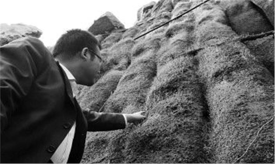 記者日前在洪山公園南大門東側(cè)看到,原本光禿禿的山體巖石上掛滿了細(xì)網(wǎng)狀袋子,上面還長滿了一層密密麻麻的小草。歷下區(qū)園林局相關(guān)負(fù)責(zé)人告訴記者,這是一項(xiàng)山體綠化新技術(shù),叫金字塔柔性生態(tài)防護(hù)技術(shù)或柔性護(hù)坡系統(tǒng)。