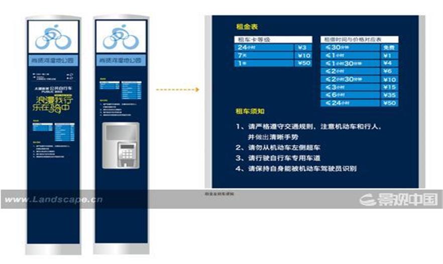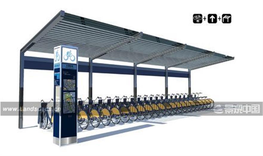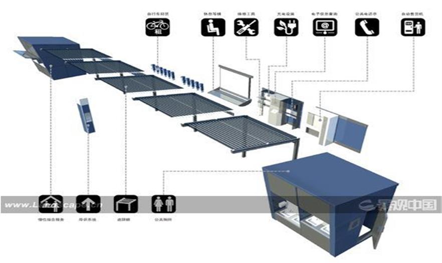 在慢行服務設施的設計中采用組合模式模塊化,以統(tǒng)一的框架整合不同功能模塊。將需求拆分為基本功能、拓展功能兩大部分,建設方可根據(jù)需求選擇性地設置,根據(jù)功能增減功能模塊的數(shù)量。且造型現(xiàn)代簡潔,功能為主,便于后期網(wǎng)點選址及批量生產(chǎn)。在運行時強調(diào)自助式,前期以人工管理啟動,依托功能綜合的自助式刷卡機逐步過渡為無人模式,減少運營成本。